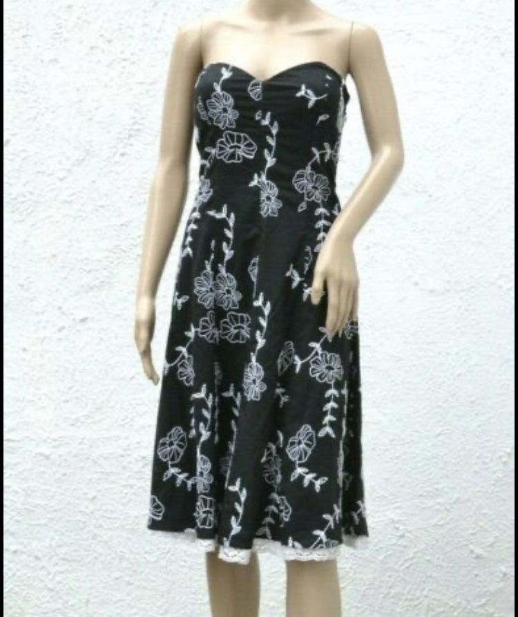 Women’s Size 8 by WHBM Fit & Flare Black White Floral Embroidery Cotton Lightly Padded Bust & Delicately Boned Lace Trim Along Bottom Hem Black Lining Side Zipper Removable Spaghetti Straps. Wear alone or with a shrug. Gently Used in good pre-owned condition no blemishes