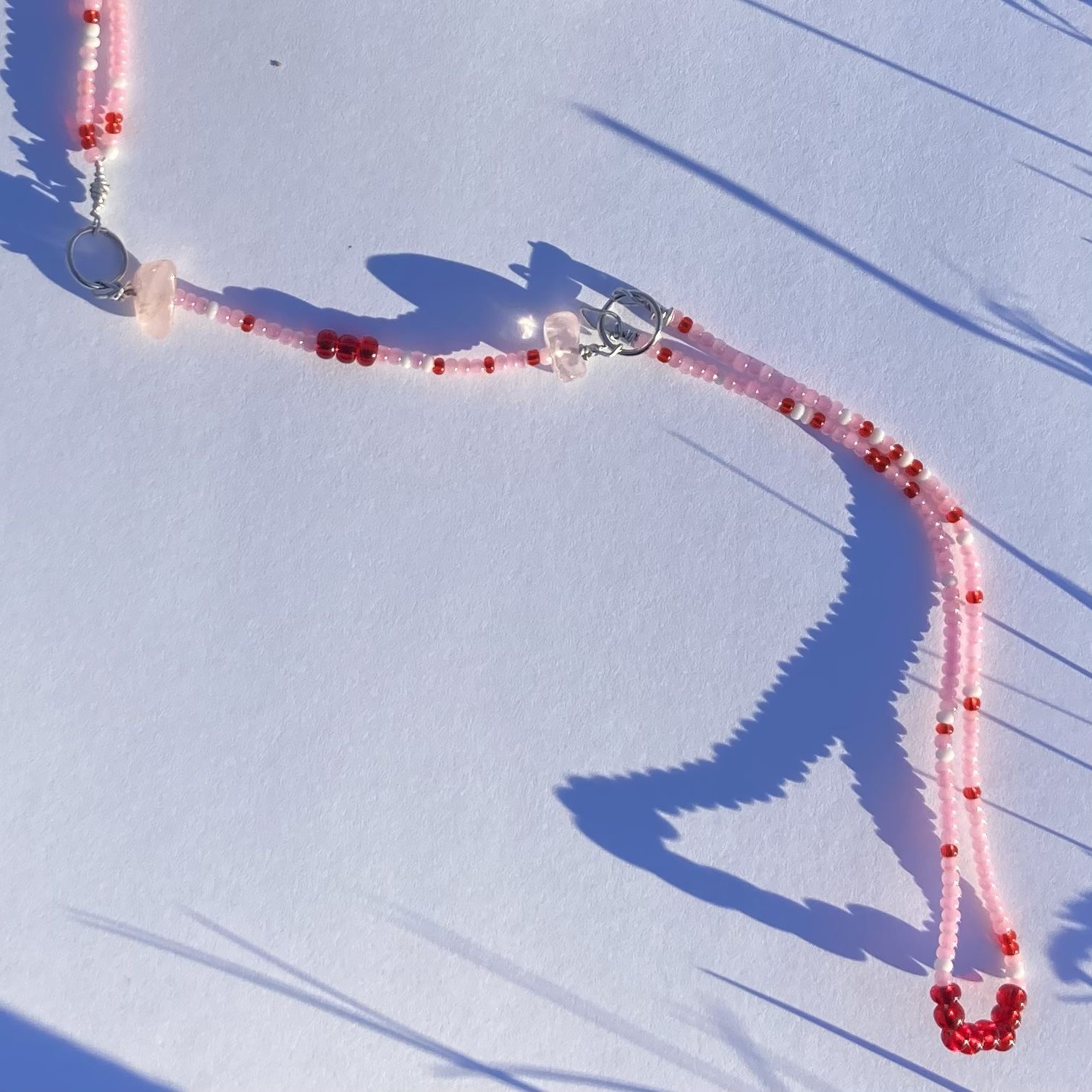 hand beaded car charm made of seed beads and rose quartz crystal chips, rose quarts is another great crystal for protection while traveling! can be placed around rear view mirror!