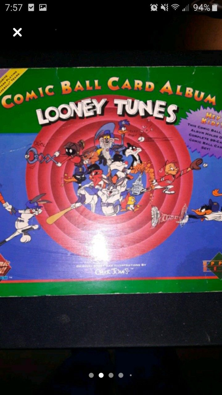 These are looney tunes upper deck trading cards. Bought it in the 90's as a kid. There are over 400 cards here. They're double sided cards. I have one of the three books filled as you can see in the pictures. The binder itself is a little damaged. But all the cards are in perfect condition. Including the ones in the box. The box as can be seen has a rectangle cut out of it. Not really sure what they are worth. Just have no use for anymore, and they are just collecting dust now