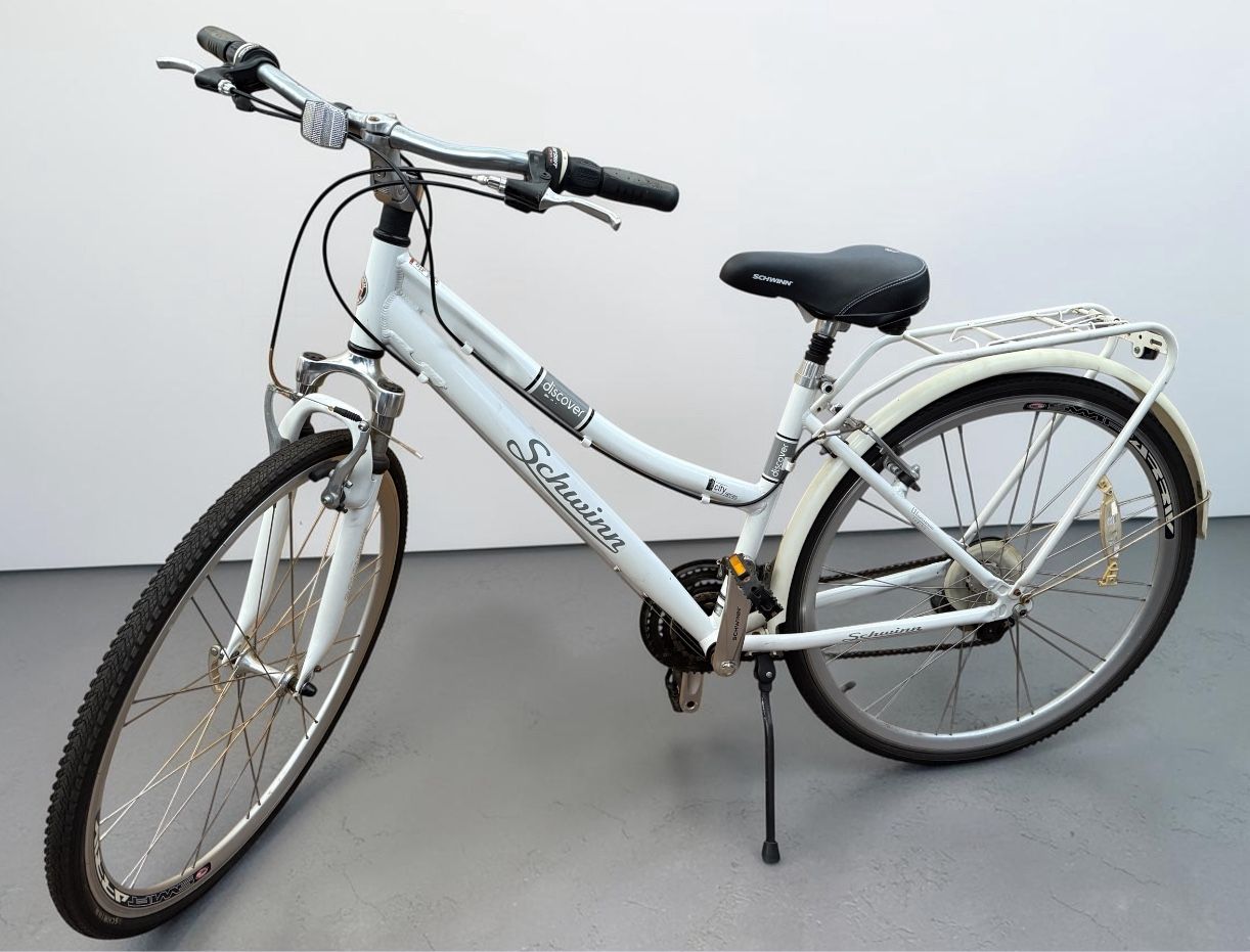 White Schwinn Discovery hybrid bike! Has a rear rack for carrying stuff and back fender and a kickstand. Ready for some rides! OPEN TO OFFERS