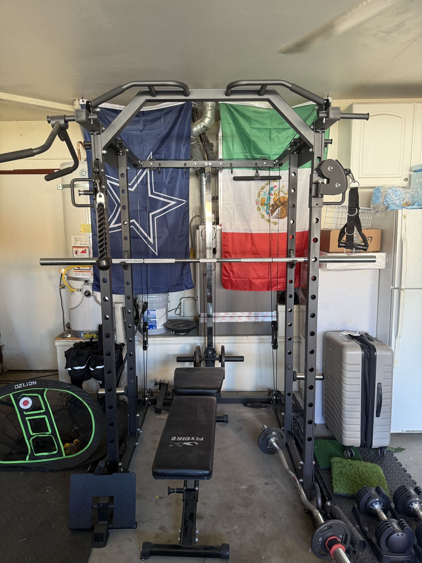 Home gym for sale. Everything that is included is listed below: Power Rack with Pully System Power rack attachments Olympic Barbell Weight Tree Rack 2 x 45 LBs 2 x 35 LBs 2 x 25 LBs **bench, dumbells, and curl bar not included**