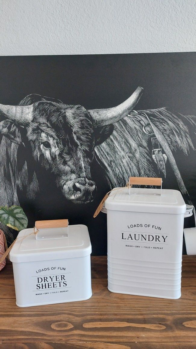 White 2pc Metal Laundry Pod Dryer Sheet Storage Containers Farmhouse Laundry Decor, Metal with White enamel paint, black lettering, and wood handles. Metal Laundry Pod or Laundry Powder Container with lid and wood handle, comes with matching scoop , measures approx. 9" tall,6' deep, and 7" wide. Metal Dryer sheet container with lid and wooden handle measures approx.5" tall, 7" wide, and 6" depth. An adorable little storage solution! Put an end to looking at those unsightly bags and containers your pods powder and dryer sheets come in,this is a beautiful but functional storage solution! New with tags and defects,priced to reflect the defects. Has some small dents (pictured) from shipping damage but isn't overtly noticable from a normal viewing distance and doesnt affect the useability at all.