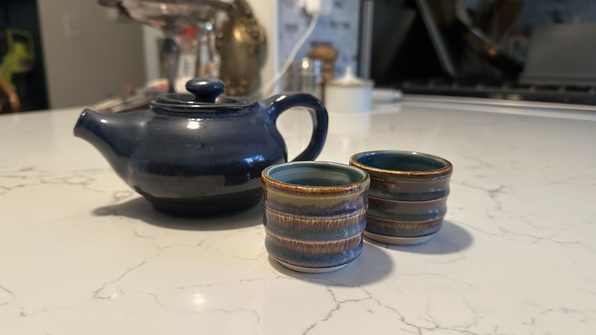 small ceramic blue teapot and pair of teacups. they are all in excellent condition; i am not even sure i used them at all. i am unsure of the origin/artists. i dont think they were made as a set, but i’ve always had them together. i am willing to split the set up, however, should you want just the pot or the cups. the bottom of the teapot is marked with “MF” and the bottom of cups are marked with “B. Schawel ‘17”.