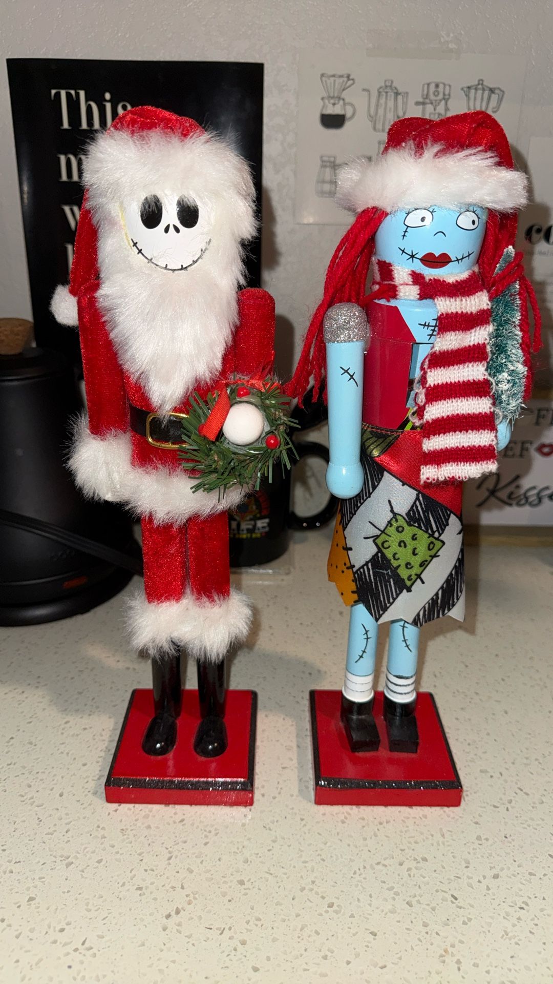The Nightmare Before Christmas Nutcrackers Appoximately 12”H Please view pictures Good condition (Unfortunately Jack was cracked once we brought it home but it’s been kept in storage in our cabinet to prevent further damage) Overall they’re both still standing and still pretty clean. I haven’t had to re glue anything back on but still two fragile pieces in general. Any questions don’t hesitate to ask thx.