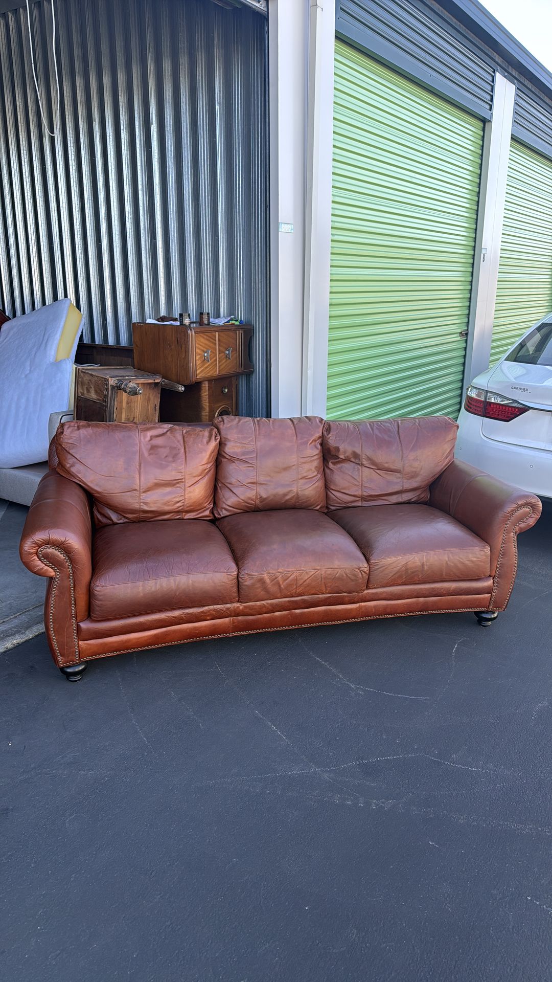 Beautiful genuine brown leather sofa with elegant rolled arms, carved wood trim, and nailhead detailing. Classic traditional style that instantly elevates a space. Leather is soft and clean with natural light wear consistent with real leather. No rips or tears. Solid frame and very comfortable. Dimensions: • Length: 7 ft 5 in • Depth: 3 ft 5 in Free delivery within 30 miles. Message if interested.