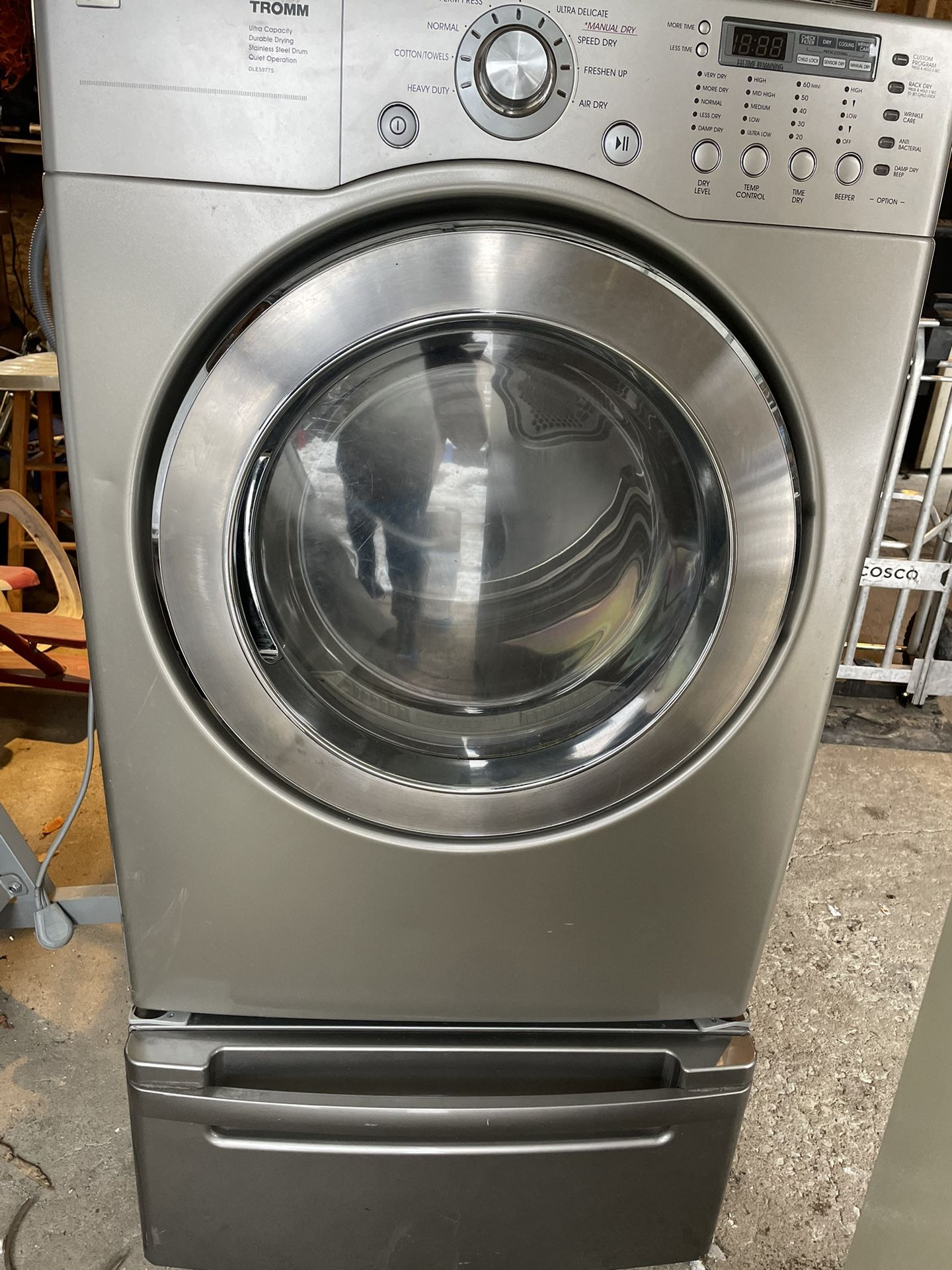 Very good condition Tromm ultra capacity Electric Dryer with Storage Pedestal. Pickup in Bridgeport or delivery for a fee.