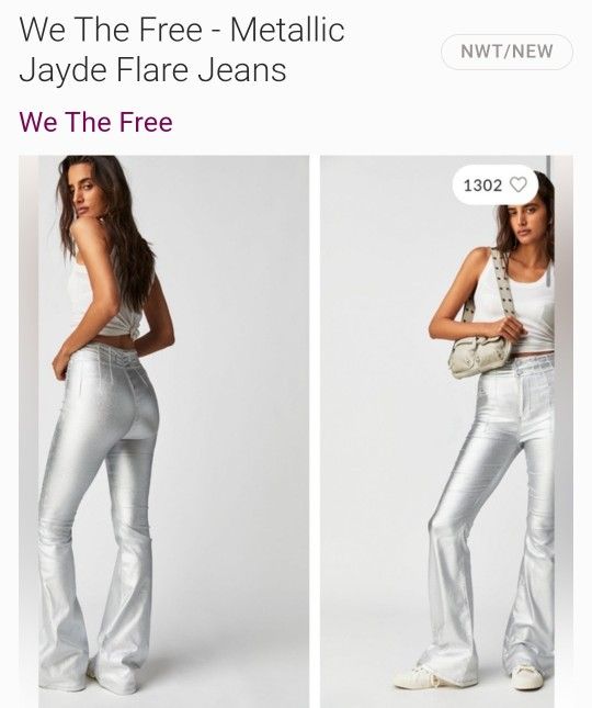 Free People High Rise Jeans 29 Flare Jayde Metallic Silver Pants Retail $148 New! Not available in stores anymore... I've been hanging on to them for New Years but lost weight... my loss is your gain! The best PARTY PANTS! Elevate your denim game with these Free Free People High Rise Jeans in Jayde Metal Silver. Zip and button closure ensures a secure fit. These pantss are made of a blend of cotton, polyester, and elastane, making them comfortable and stretchy. The are a 29-inch waist and 32-inch inseam. These jeans are perfect for any season, really, because... any day can be a party! Whether you're going for a winter layered look or a summer sunny day out with a halter. They are pants are machine washable. Get ready to rock these stylish jeans from Free People!
