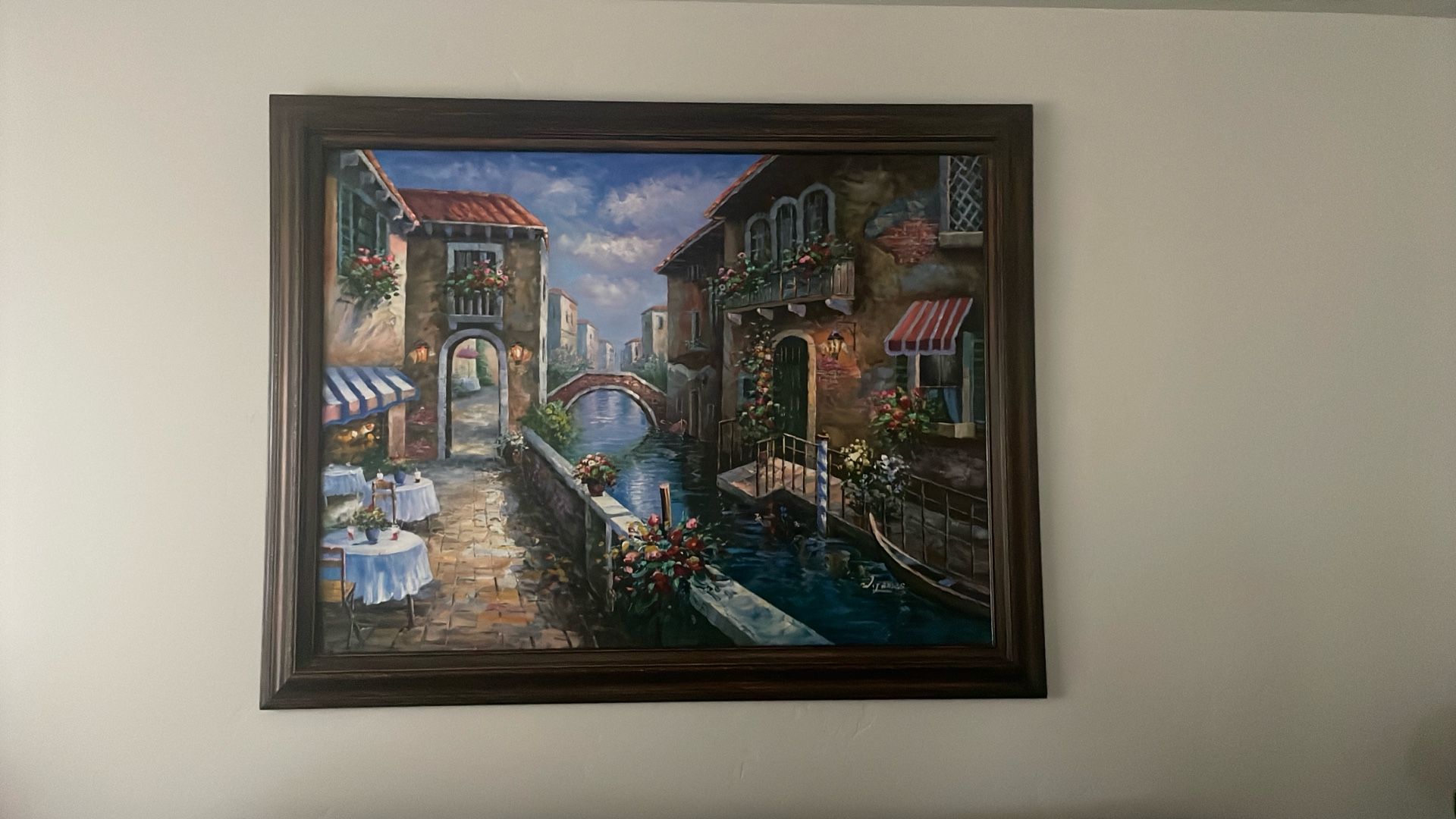 I purchased this painting at the Orange County swap meet in California. All hand painted. The frame was a lighter color and I stained it dark. 55x44