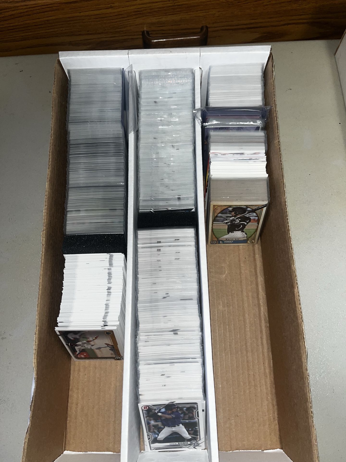 1000+ Baseball cards all in mint / near mint condition! Many are already sleeved! Product is described in photos shown. Many rookies and numbered cards! All from 21/25 Topps / Bowman Box doesn’t have lid! Asking $60 for everything Message if interested in multiple items! Trevor’s Collectibles and Car Parts
