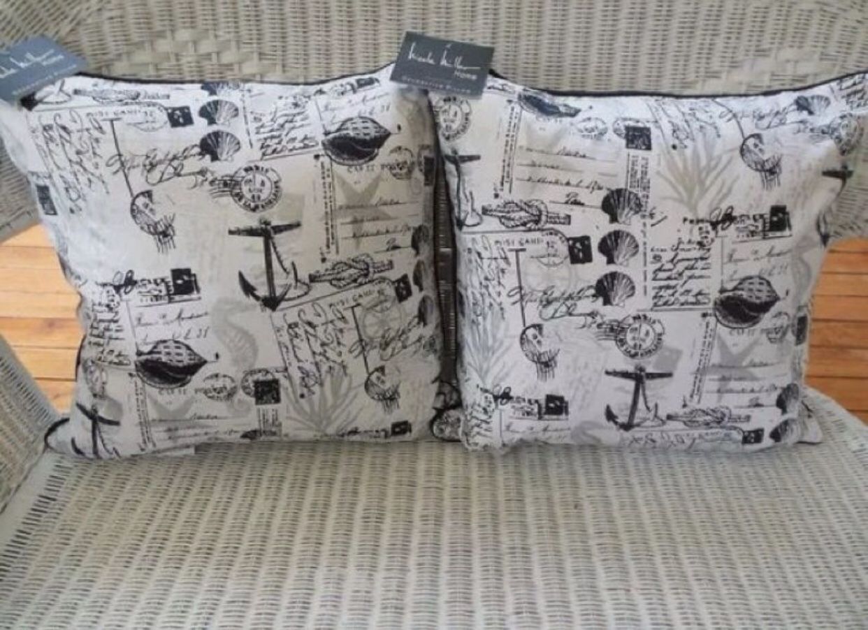 Nicole miller nautical french script and shells decorative pillow product overview this is a beautiful nicole miller home decorative pillow. It is white withnavy blue french script and shells and has beautiful silver details. Great foryour beach house, nautical themed room or any place a touch of the sea isrequired. Details: product dimensions: 20 x 20 x 4 inches ; 2. 5 pounds shipping weight: 2. 8 pounds origin: pakistan features: shell 100% cotton, fill duck feathers imported designed by nicole miller white pillow with navy blue french script and silver detailing 20 inches by 20 inches 100% cotton cover with duck feather stuffing makes a beautiful accent piece for any decor please feel free to ask any questions or concerns before bidding