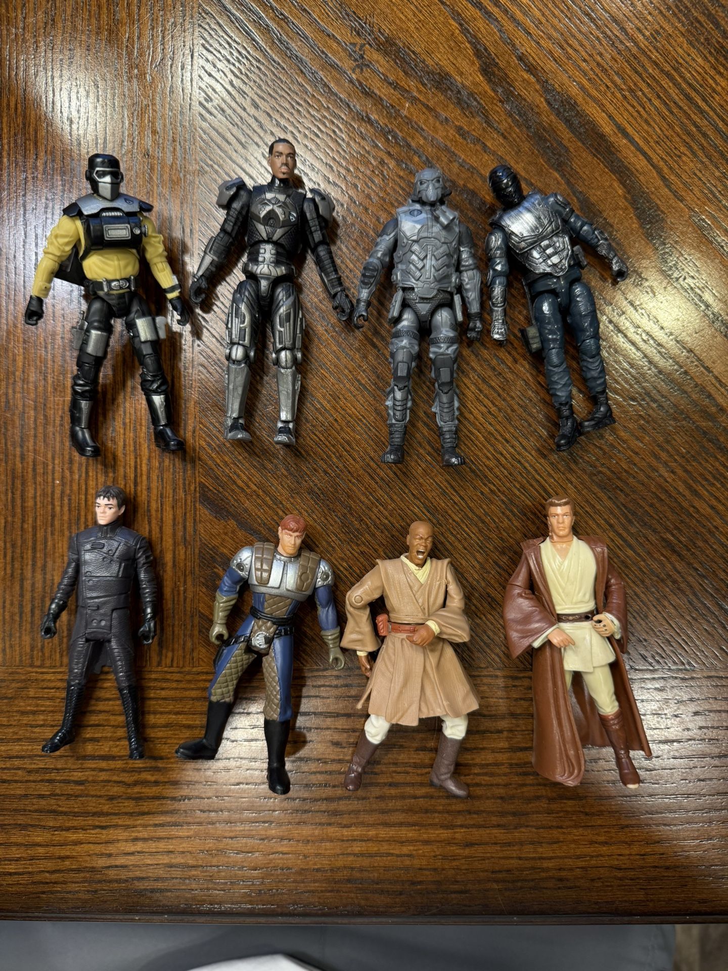 All 8 figures for $25. Want 1 figure for $10 or take them all for $25 Gi joes Bbq Firefly Roadblock Snake eyes Star war OB1 Mace Windu Dash Rendar Some random dude that old Han Solo beat up.