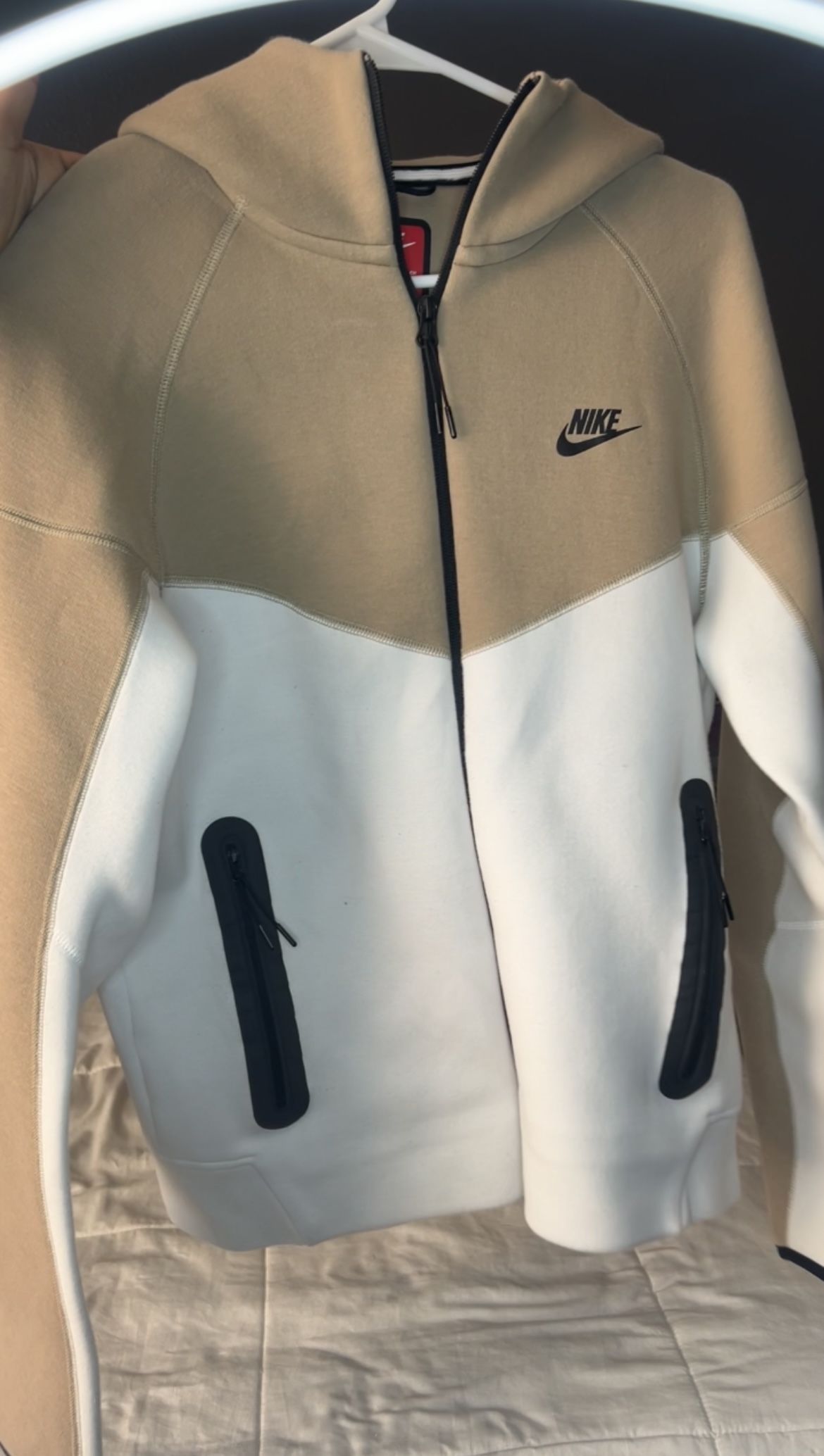 This is my Nike Tech set that doesn’t fit me anymore. The hoodie is a size small, and the sweats are a size medium. I can sell them separately if you prefer. If you have any questions, feel free to ask. White/Khaki