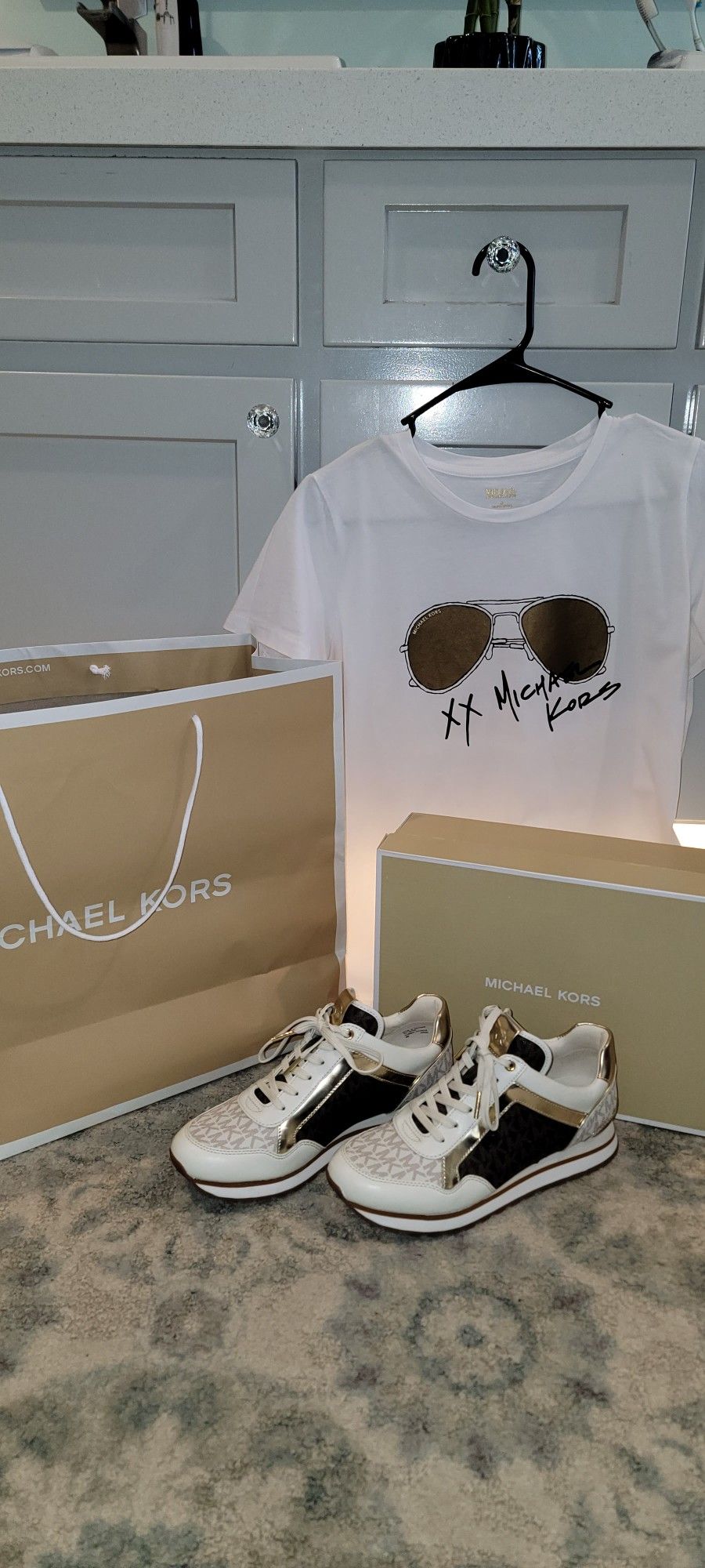 Michael Kors Size 8 sneakers and Medium top, nearly brand new, only wore once, comes with original shoebox and bag. Firm on price, serious inquiries only.