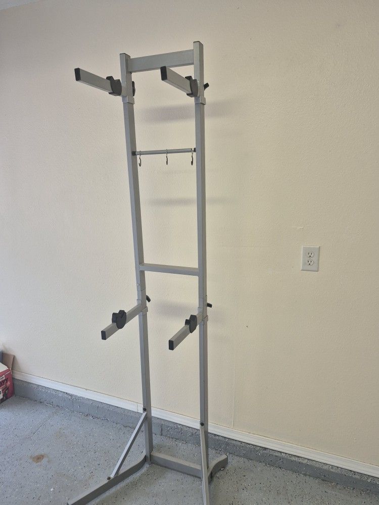 Raxgo freestanding Bike rack 2 piece easy assembly No permanent mounting or hanging required Compatible with most bikes 82" high; 14" wide; 16" deep (Base is slightly larger)