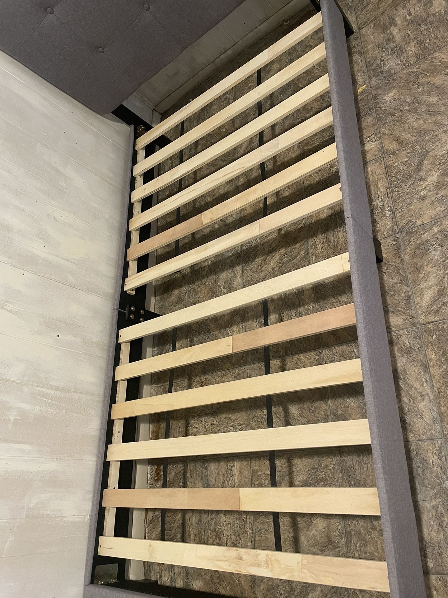 Twin size upholstered bed frame with tufted gray headboard. Includes wooden slats — no box spring required. Gently used and in good condition. Sturdy frame, neutral color, and modern look. Perfect for a child’s room, guest room, or small space. Details: • Twin size • Upholstered tufted headboard • Wood slat support system • Mattress not included • Ready for pickup 📍 Local pickup only 💬 Open to reasonable offers