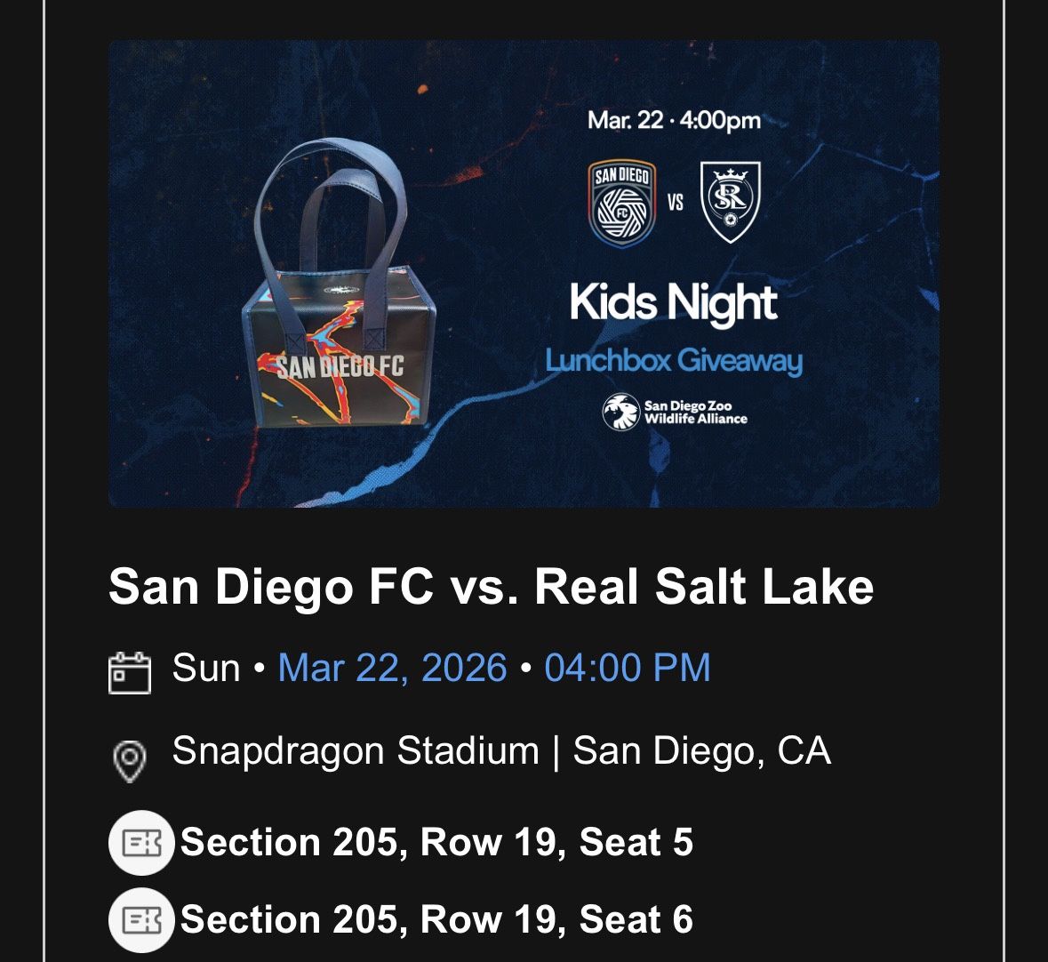 2 FC San Diego FC vs. Real Salt lake 4:00 tickets. 120 for both.