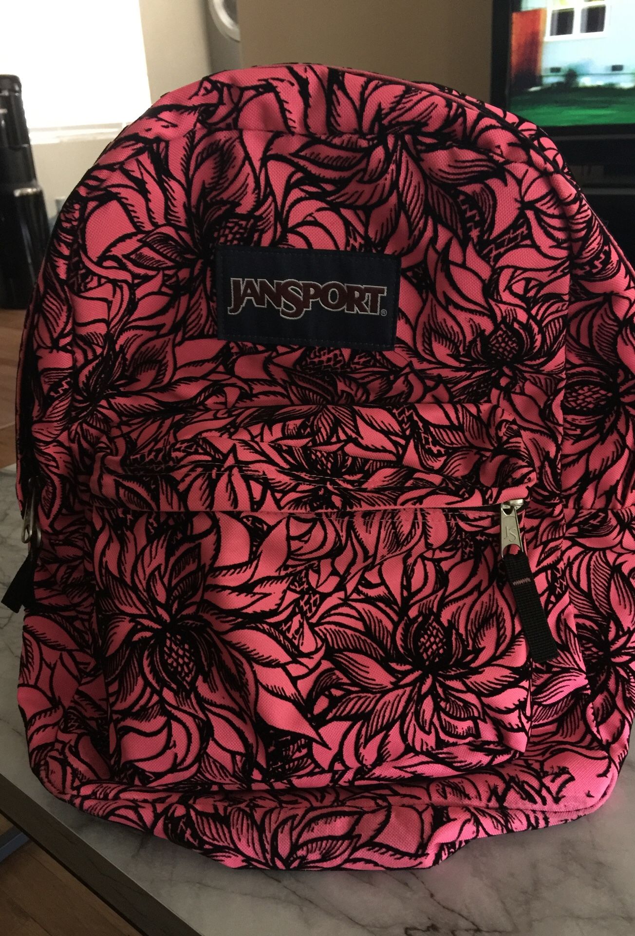 Jansport backpack used in great condition, is washed and clean ready to sell. 1 large pocket with zipper and 1 small pocket with zipper. Color is beautiful with the black print being velvety soft .