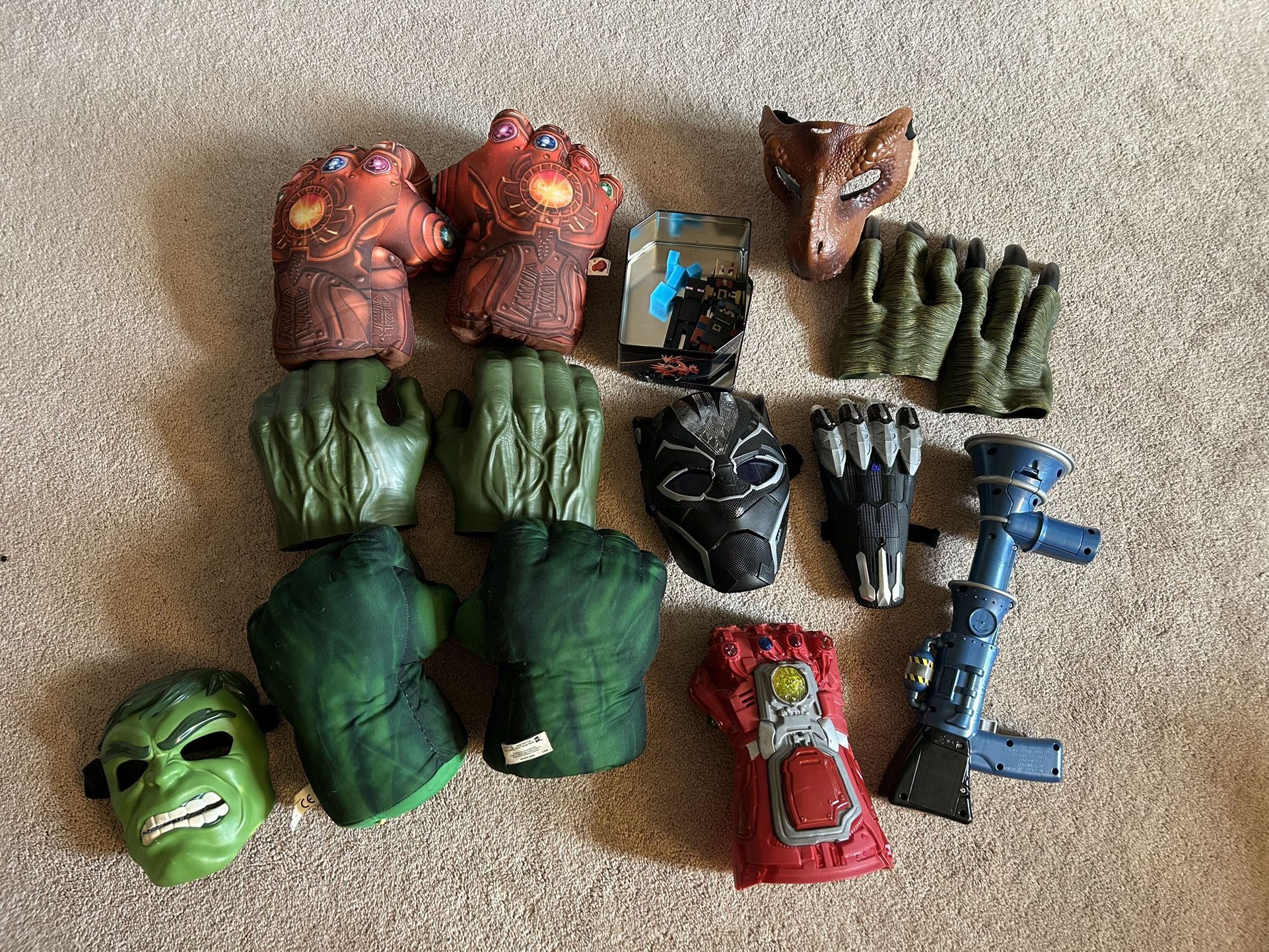 Hulk hands - 2 kinds (1 makes sounds when punching - just needs new batteries - I THINK) Hulk mask Thanos hands - 2 kinds (1 makes sounds and lights up) Black panther- mask and glove Dinosaur hands and mask (velociraptor- I THINK) Minion fart gun and Minecraft figures If you want to buy individually, let me know which piece(s) and send an offer