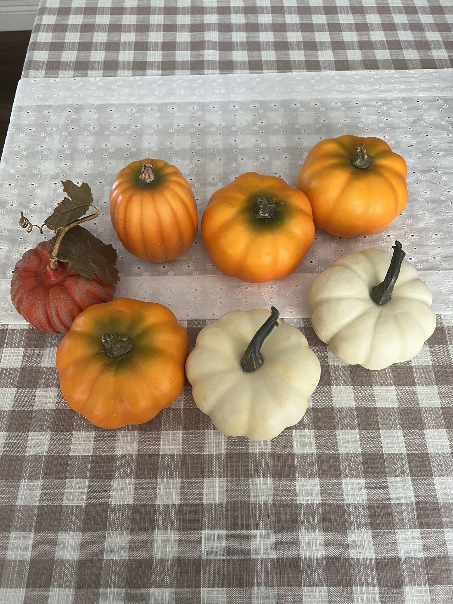 Set of seven mini pumpkins in various sizes. Smallest is 3 1/2” round & 2 1/2” tall. The others are approximately 4 1/4” round & 3 1/2” tall to the stem. In good condition.