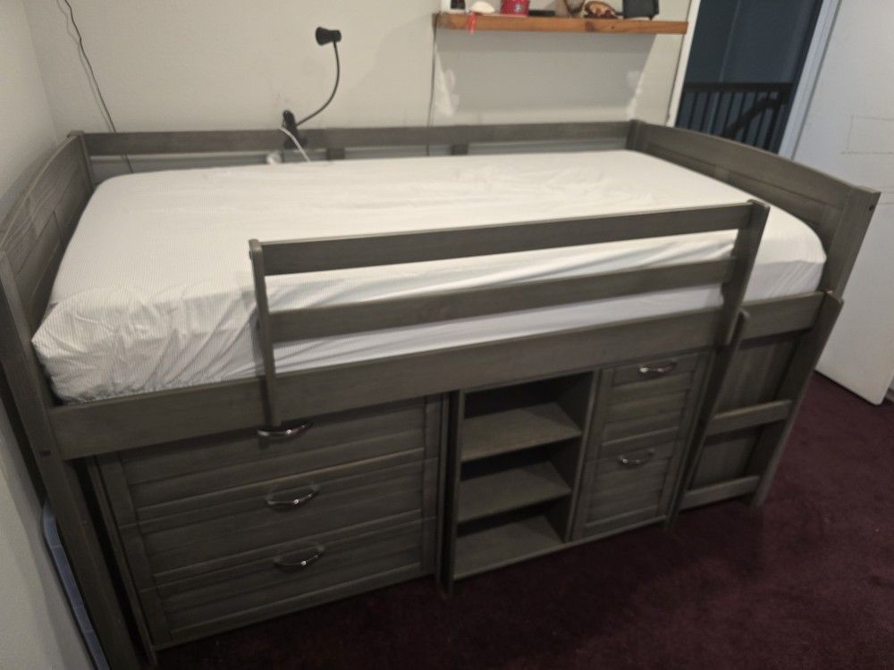 Low Loft Bed. The bed has very little use, and is like new. Comes with three drawer dresser, book shelf, three shelf storage nook, and storage drawers. These items can be arranged in multiple configurations. The mattress can be included as well if you want it. L- 78", H-44", W-41 1/2"