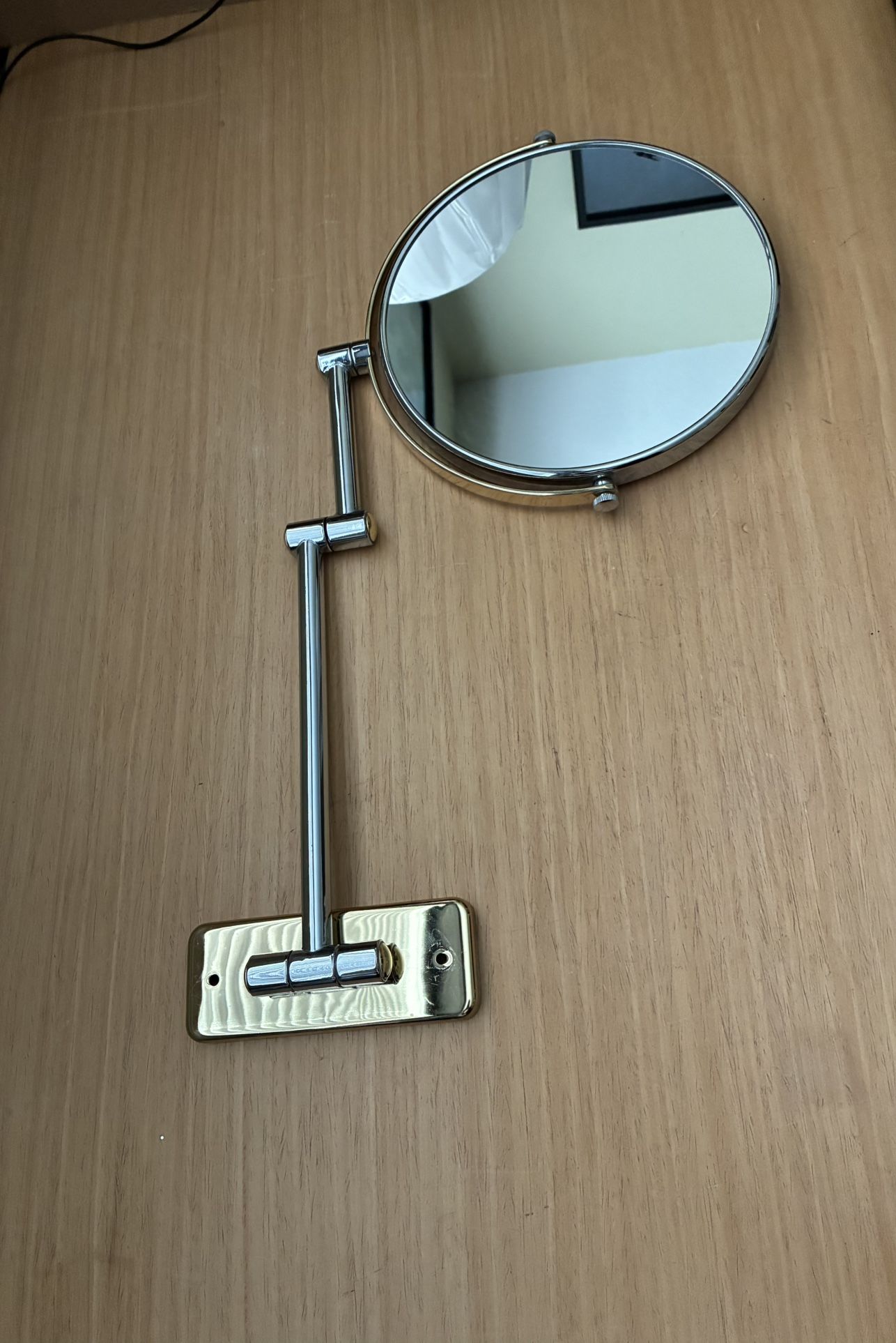 Expandable arm, color is silver and gold plated One side is reg the other side is 5x magnification Mirror measures 7.5” located on Herndon and Polk