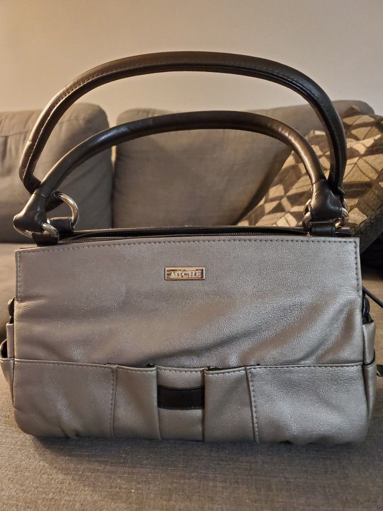 Miche bag with 3 interchangeable shells. Silver with black accents, solid black, and gray design with fuschia accents. Dimensions are 12 long x7 tall x 4.5 wide Also includes rings to extend handles already on purse, and handles to make it an over-the-shoulder purse. Very good condition; however there is some parts ever fuschia accent is flaking off.