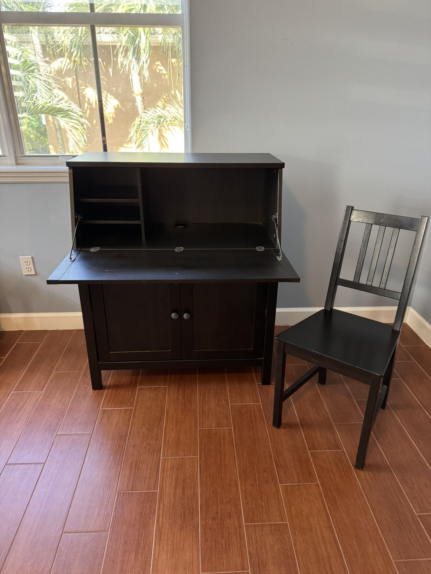 Dark Espresso desk and chair great condition Depth 18 in Height 42.5 in Width 35 in .