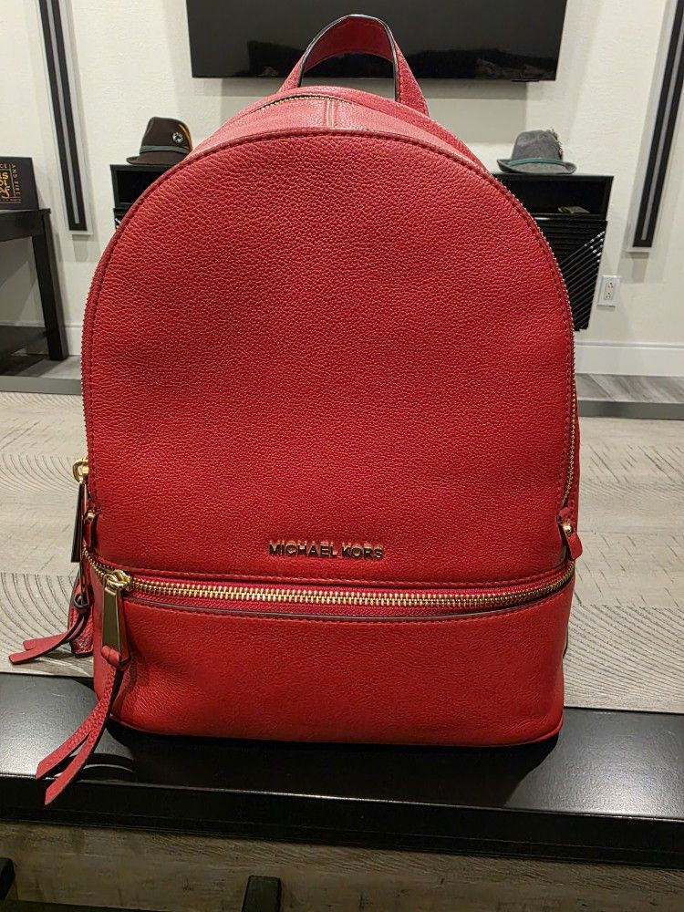 Red Michael Kors bag. 3 pockets on the outside. 1 zipped pocket on the inside a slim compartment for holding a tablet, and pockets to hold cards in. Great condition