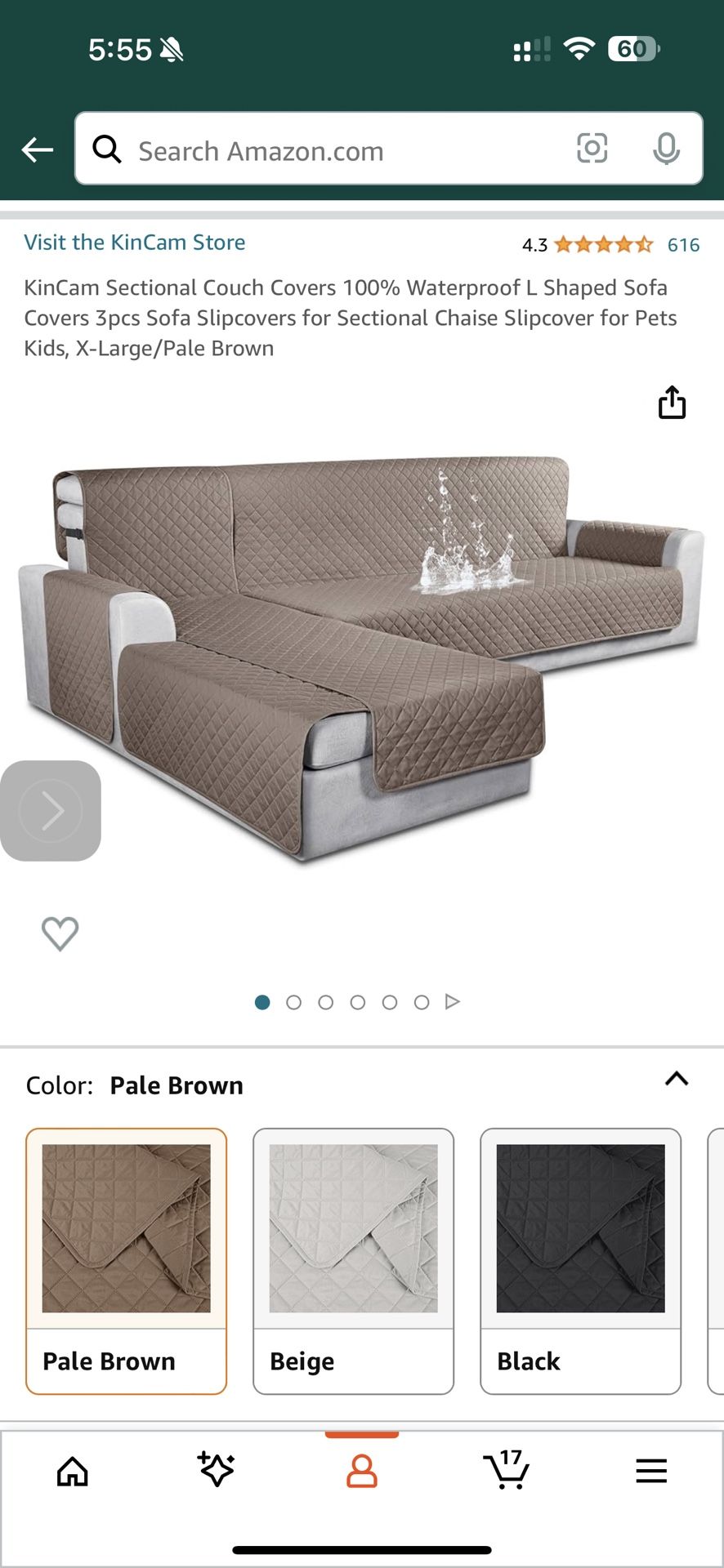 KinCam Sectional Couch Covers 100% Waterproof L Shaped Sofa Covers 3pcs Sofa Slipcovers for Sectional Chaise Slipcover for Pets Kids, X-Large/Pale Brown bout this item 100% Waterproof & Comfortable: (This L shaped couch cover is Patented) KinCam L shaped sofa cover are made of high quality 100% waterproof polyester, which inner layer is filled with cotton, feel very cool to touch, comfortable and durable. It's suitable for most of the sectional couch. Good Choice for Furniture Protector: Sectional couch cover can protect your sofa furniture from scratch, dust, dirt or pet hair. The waterproof design of the sofa cover keeps liquids (like water and beverages) from getting your sofa wet. And gives your old sofa a new look. It is ideal for homes with children and pets. A variety of colors to suit your home style. Multiple Size Options: Our sectional couch covers are suitable for both left and right chaise. KinCam L-shaped sofa cover come with 3 pieces cover, one for the main sofa and the other two for the chaise . Please measure the size of your sofa before purchase, follow the Instructions to make sure that our sectional sofa covers can match your sofa. Easy Installation: Easy to fit for your sofa with our user manual. Just drape the furniture with our covers, tuck the excess fabric into the gap between the back and couch cushion, then insert the non slip foam sticks into the gap to make it not easy to slide. Use the elastic straps secure the slipcover stay in place firmly. Easy to Care: Hand wash or machine washable, wash at a temperature below 30 degrees Celsius. Do not bleach. Do not iron. We provide premium quality sofa cover, and focus on giving good customer service. Please contact us for any questions and we will be pleased to assist you.