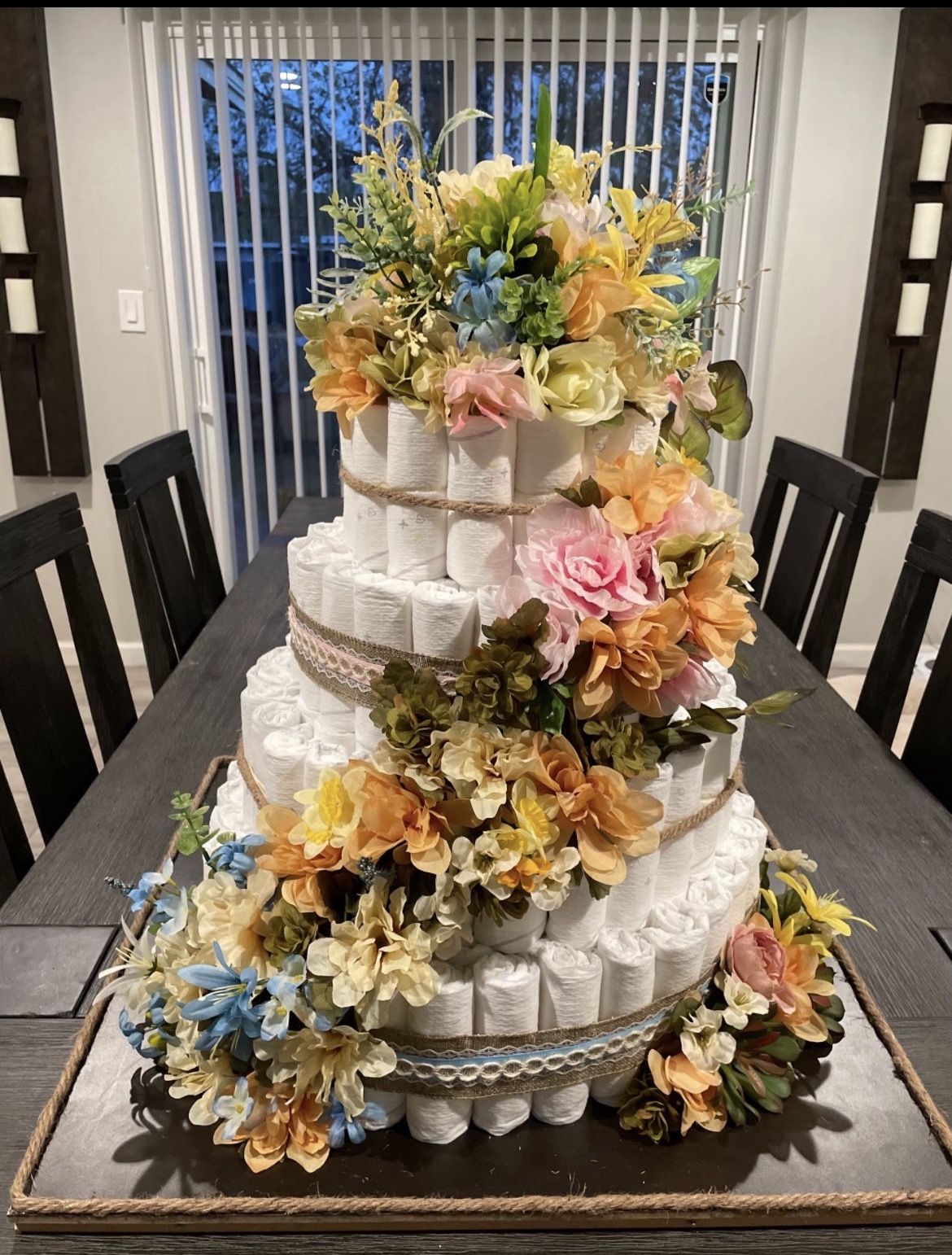 Diaper cake, any color you want to match your theme. All materials, flowers, and diapers included. These are made to order so please allow at least 1-2 weeks for completion. Feel free to message me with any questions π