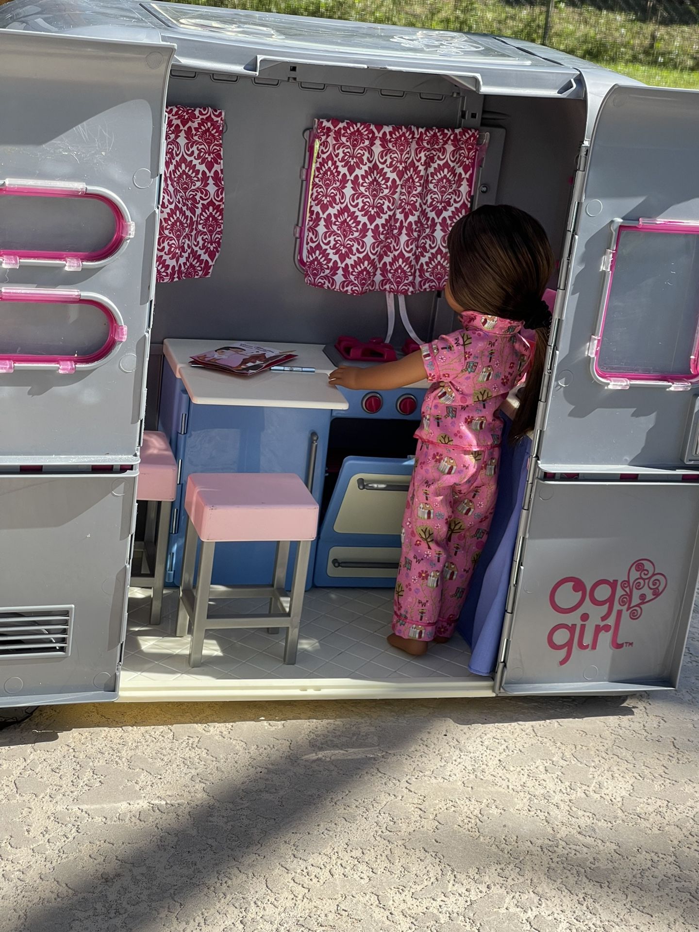 Hello this is an our generation camper it doesn't come with doll sadly it is in great shape you and this camper can go any were.