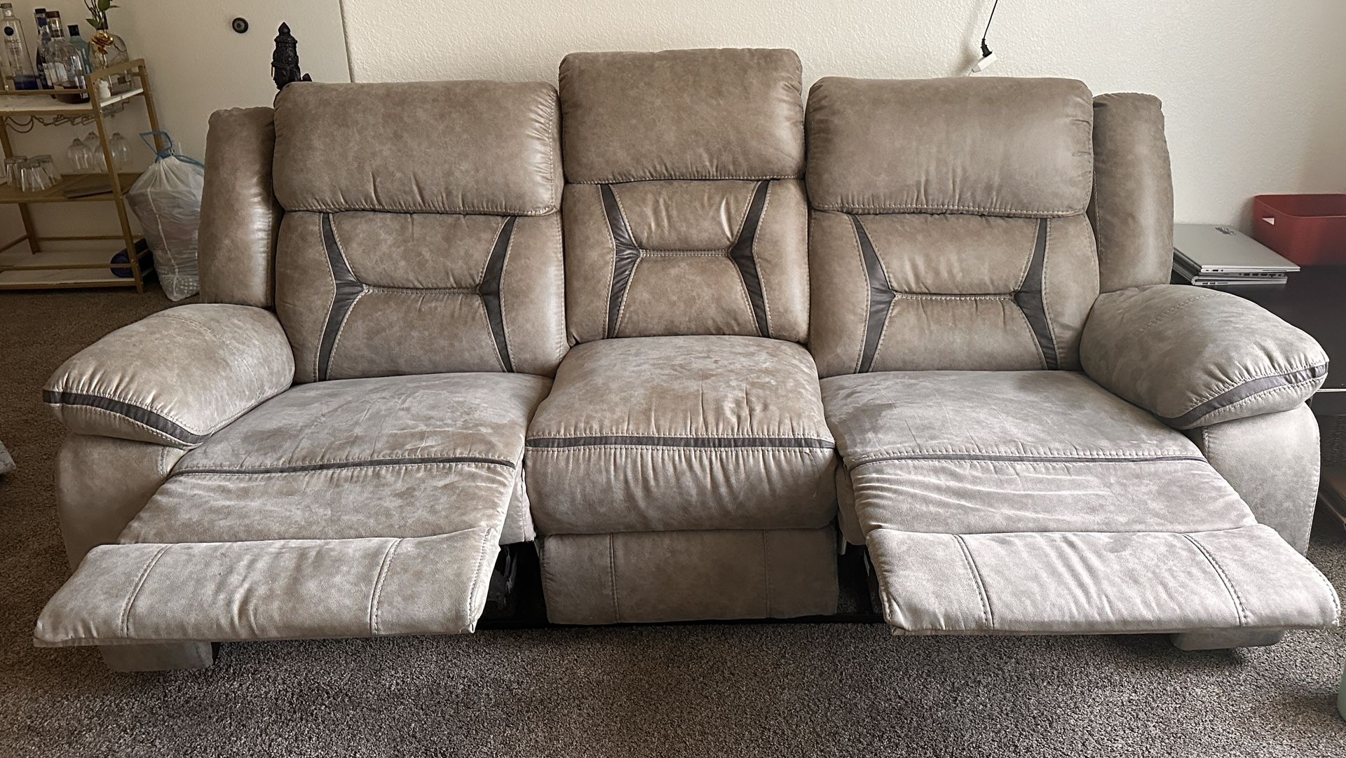 Manual 3-seat recliner. Equipped with outlets to charge your phone, end seats recline and are very comfortable. Bought just few months ago. Needs gone ASAP moving out. Smoke and pet free, Very easy to dissemble and assemble. Asking 350 or best offer.