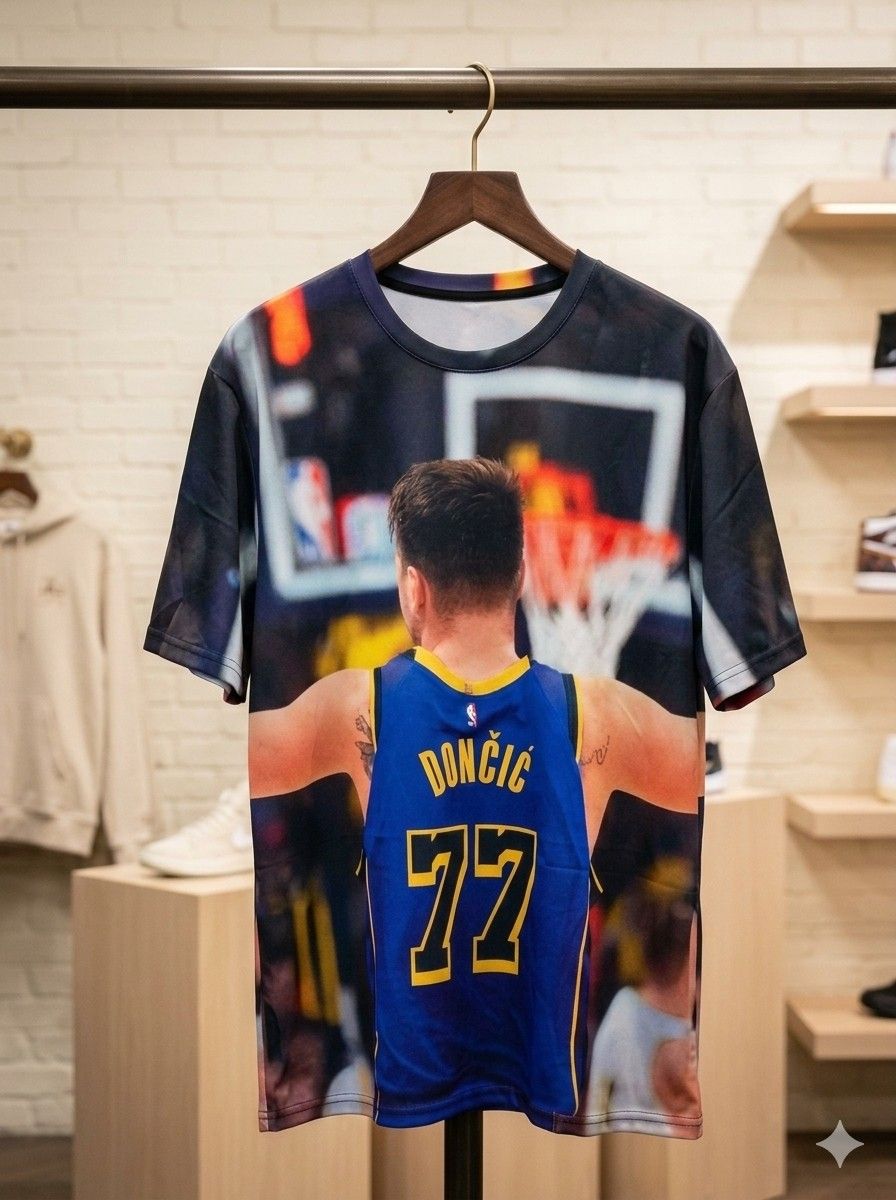 Luka Doncic polyester tee for pick up in inglewood. Image on both sides.