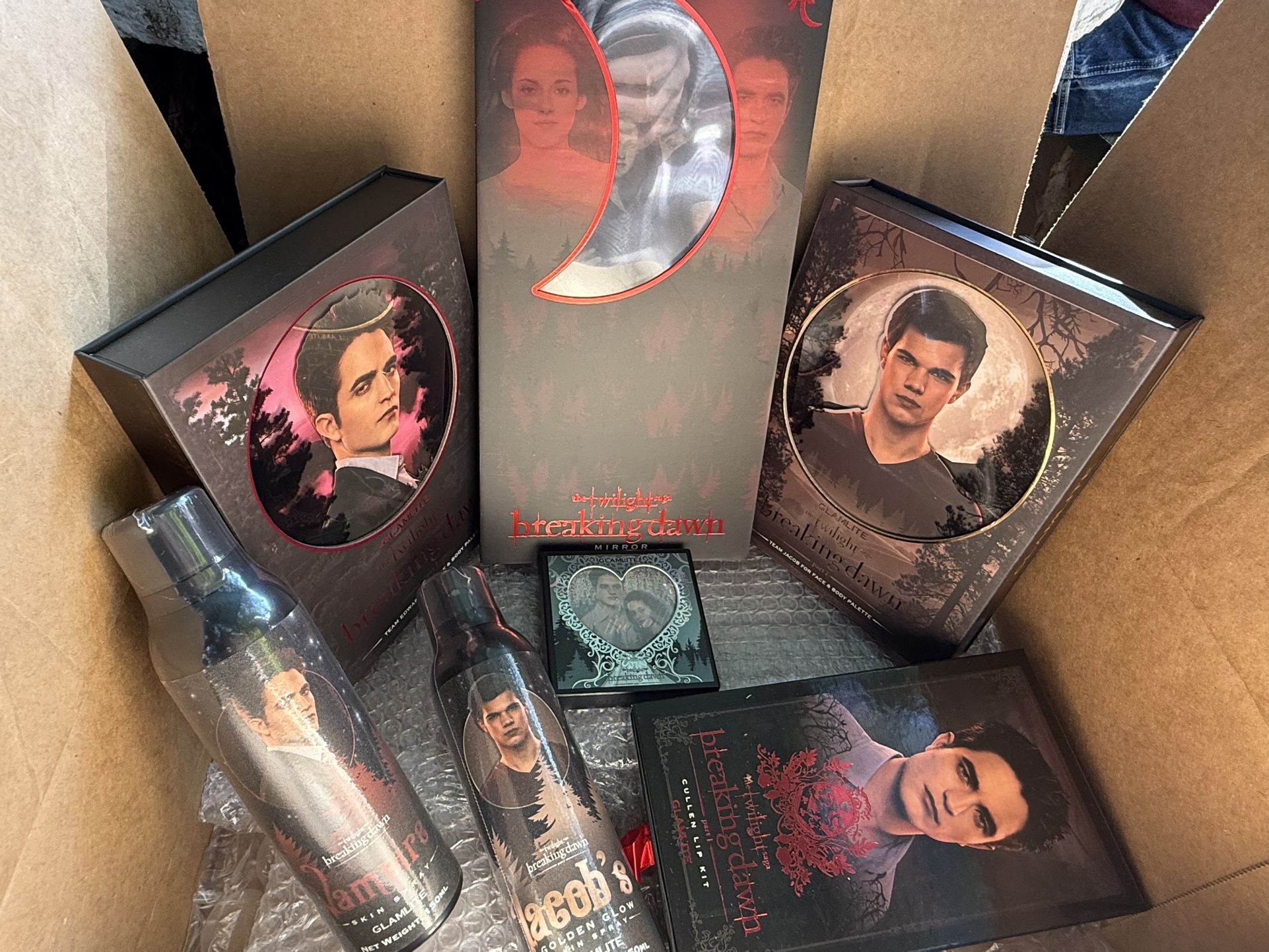 The set is brand new and only took them out of the plastics to get a better picture. It’s a 7-Piece Bundle includes: ( Team Edward Palette, Team Jacob Palette, Wedding Highlighter, Cullen Lip Kit, Vampire Skin Spray, Bella & Edward 3D Lenticular Motion Mirror )