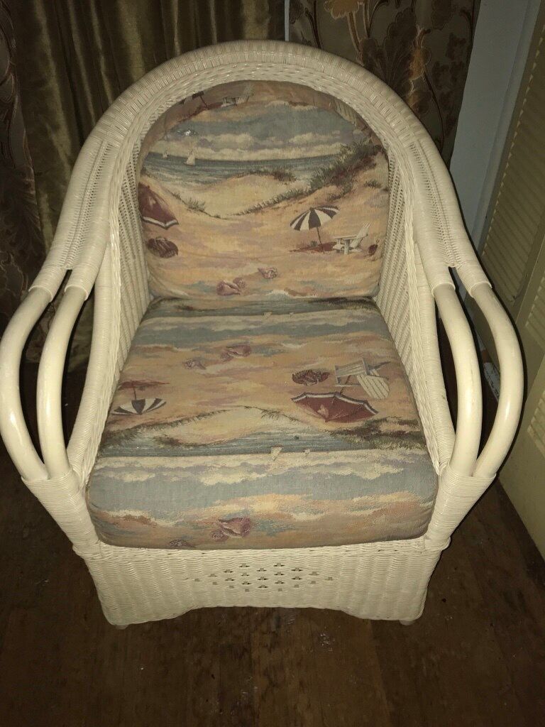 BEAUTIFUL VINTAGE WICKER CHAIR. MOVING MUST SELL. BEACH, OCEAN, COTTAGE NAUTICAL DECOR. LIKE NEW CONDITION.