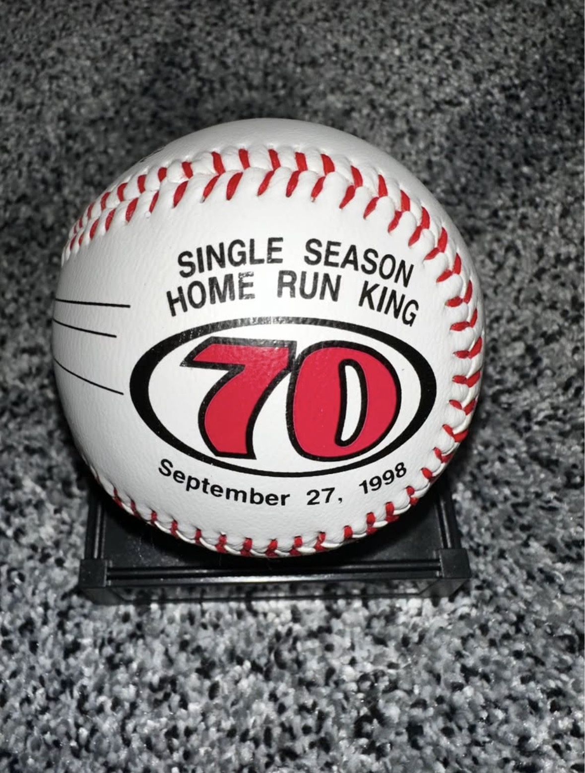 1998 Mark McGwire single-season home run record commemorative baseball. Details: • Rawlings baseball on display stand • Printed text: “Single Season Home Run King – 70” • Date: September 27, 1998 • Replica signature printed on ball (NOT hand-signed) • Includes original Certificate of Authenticity stating the signature is a replica • Ball is clean and displays well • COA included and clearly labeled as replica signature This commemorates McGwire’s 70th home run season.