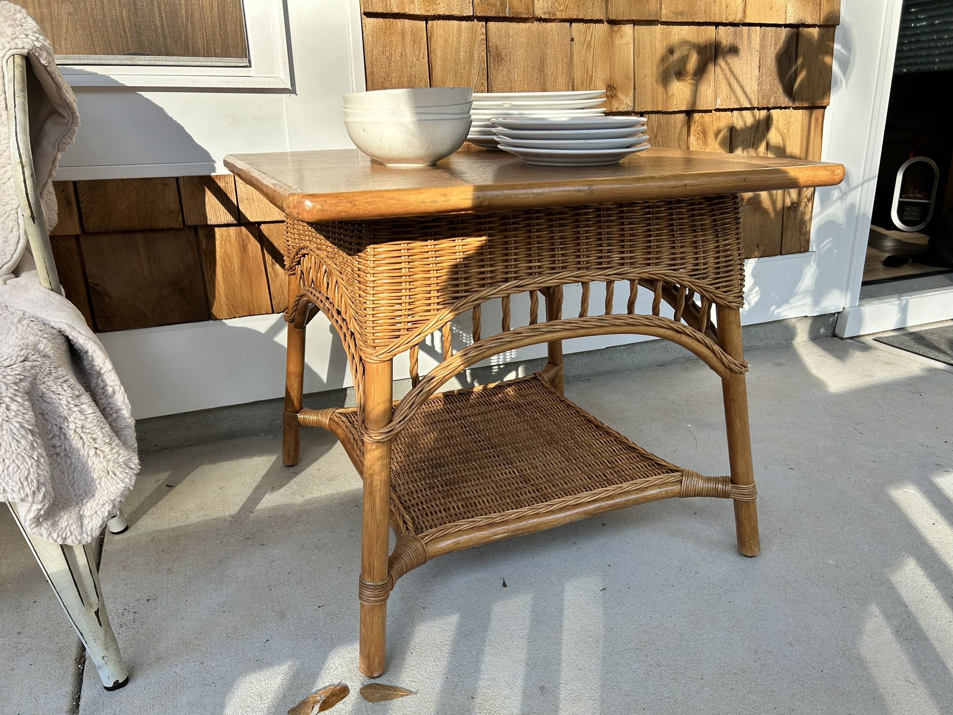 Square wooden top, wicker apron and shelf, wood post legs. Table has been used inside house. See dims. Sturdy, yet easy to move about. No splintered edges or unraveling. Will make a good accent for any room or porch.