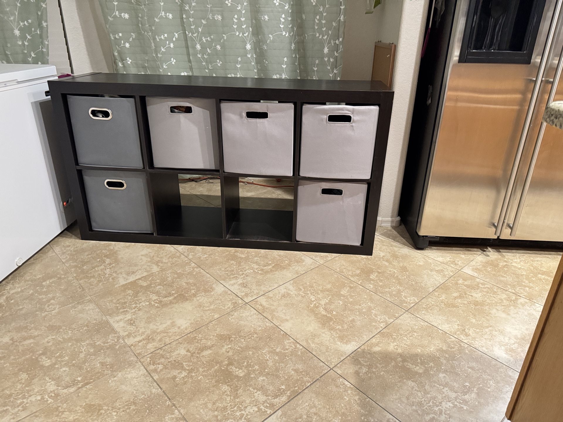 It comes with 6 fabric storage bins. Measurements : 60” long 31” high 15.5” Deep Couple small scratches on top . Overall in great shape. Super solid and durable.