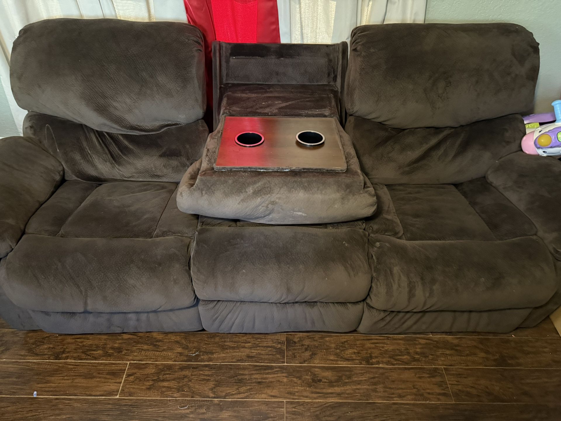 3 piece Couch set for $500 in Pasadena Tx 77504 Soft Velvet material All recliner Big Couch has cup holder in the middle if folded down