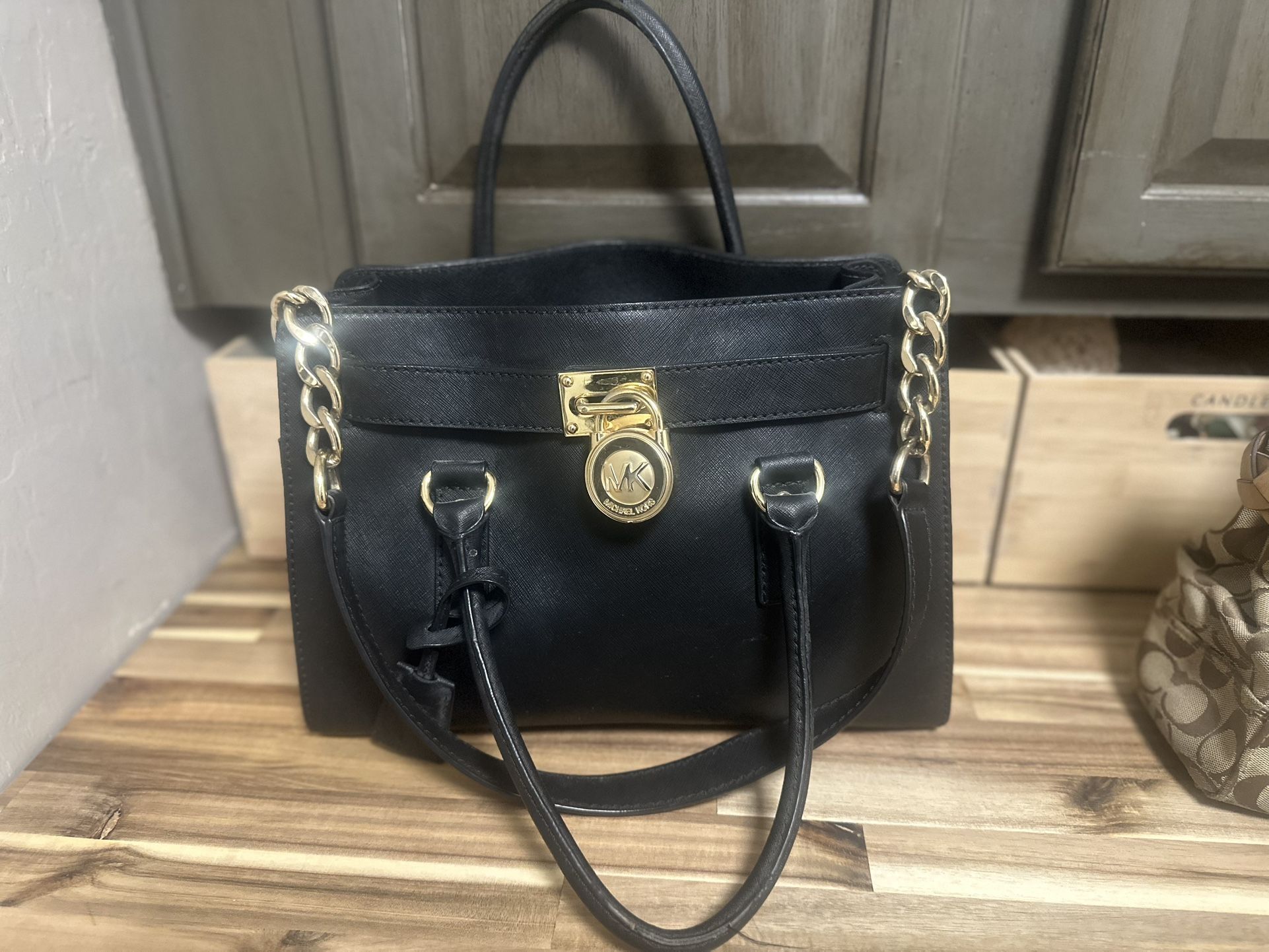 👜 Coach Tan Handbag $60 Elevate your everyday look with this Coach tan leather handbag, crafted from supple, high-quality leather. Its structured silhouette and sturdy top handles offer a polished, timeless style. The warm tan color pairs effortlessly with any outfit, while the spacious interior provides practical storage for daily essentials. Finished with minimalistic Coach branding and elegant stitching details. 👜 Coach Black Handbag with Signature “C” monogram - $60 This Coach black handbag features the iconic signature “C” monogram design in canvas, complemented by sleek black leather accents and polished silver-tone hardware. With dual top handles and a zip-top closure, it combines function and fashion. The compact yet roomy interior is perfect for carrying your must-haves, making it a stylish staple for any occasion. 👛 Coach Black Wallet $45 A chic companion to any bag, this Coach black leather wallet features refined pebbled leather, subtle Coach branding, and practical interior compartments. It includes multiple card slots, a billfold section, and a zippered coin pocket—perfect for staying organized with style. 👜 Michael Kors Black Handbag with Gold Chain Detail $100 Make a statement with this stunning Michael Kors black handbag, featuring luxe gold-tone chain straps and a signature MK locket charm at the front. This handbag offers a structured, elegant shape with a roomy interior for everyday use. The contrast of black and gold gives it a glamorous, fashion-forward edge.