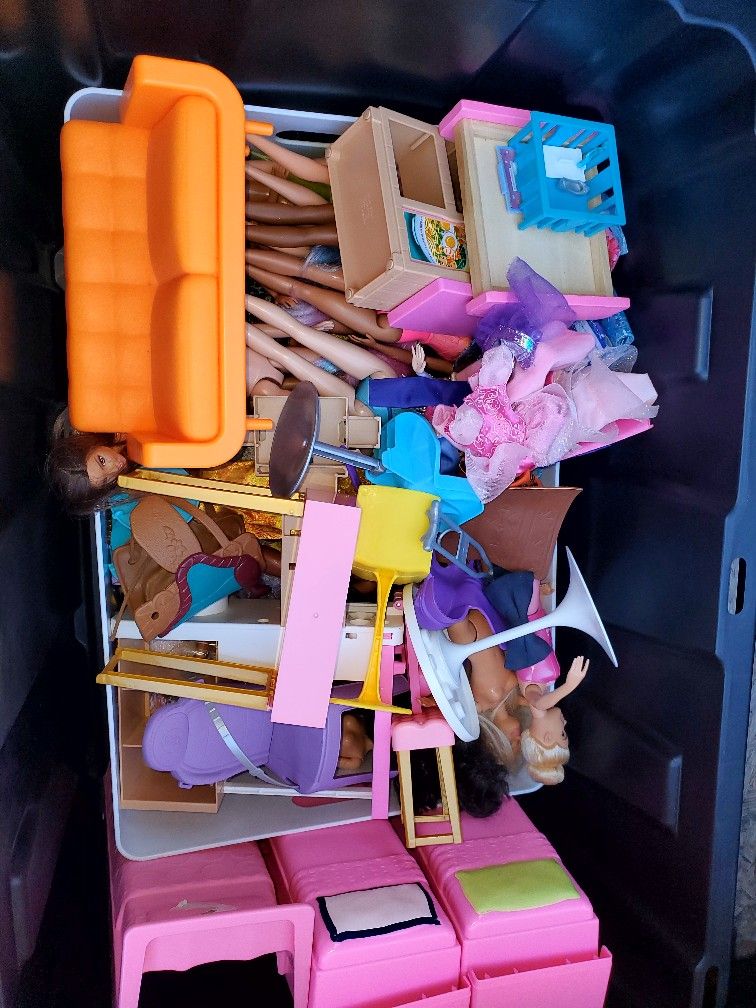 Lots of barbie dolls with no clothes. Some barbie beds and furniture, misc stuff. Make offer for the whole box. Over 20 or 30 barbies