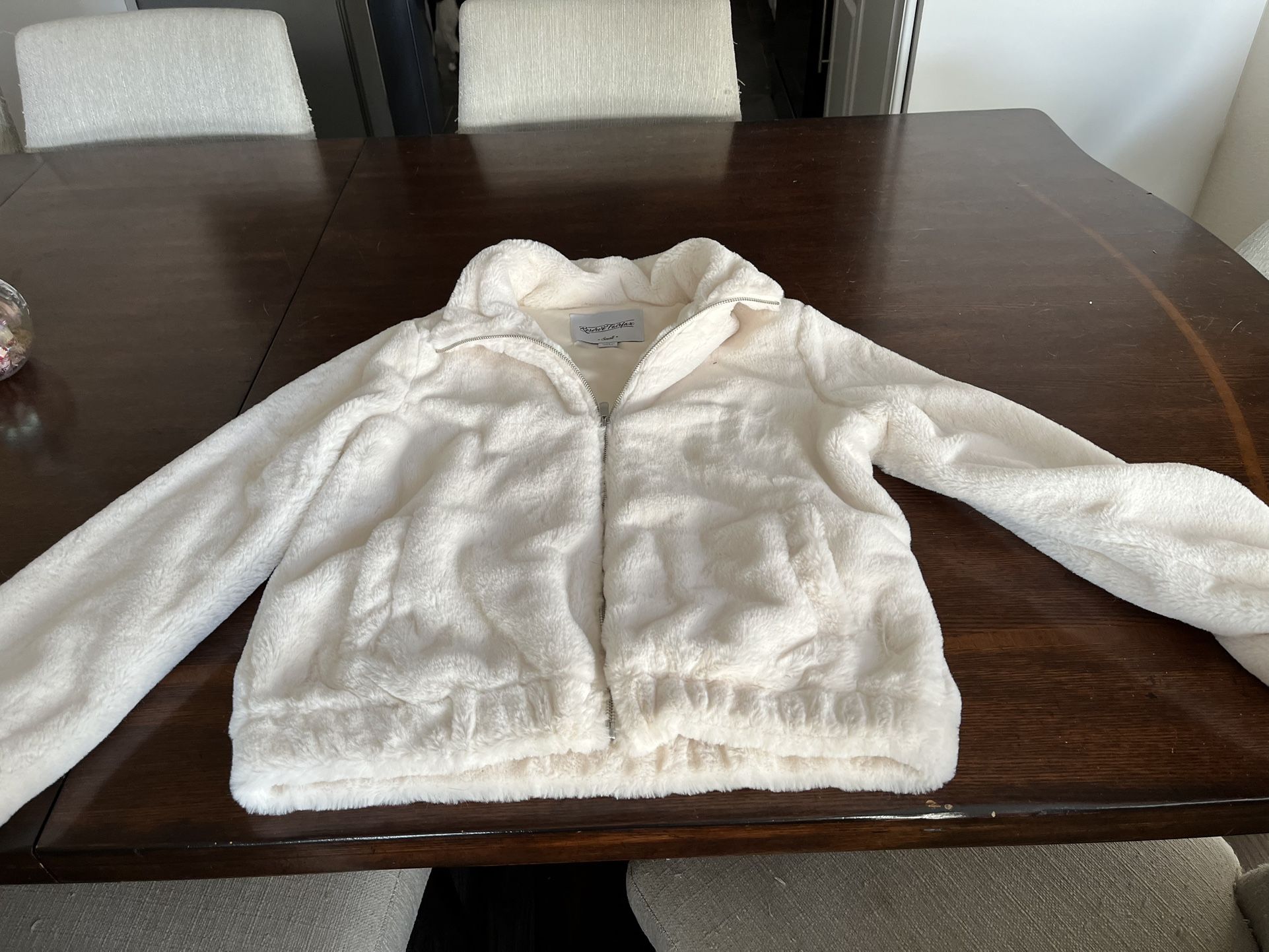 Good deal. Looks new. Worn a few times. Lightly worn.. Shell Faux Fur, 100 percent polyester lining. In good shape. Thickness is good. Cash only. Will meet at local McDonald’s to avoid shipping costs. Must sell daughters belongings before she leaves for the University.