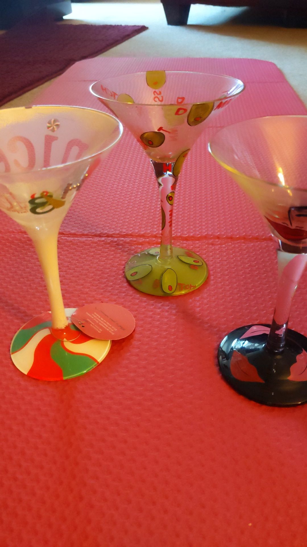 3 Lolitta collector martini glasses . Dirty martini, Flirtini and Naughty or Nice martini glasses..$25 each or all three for $50