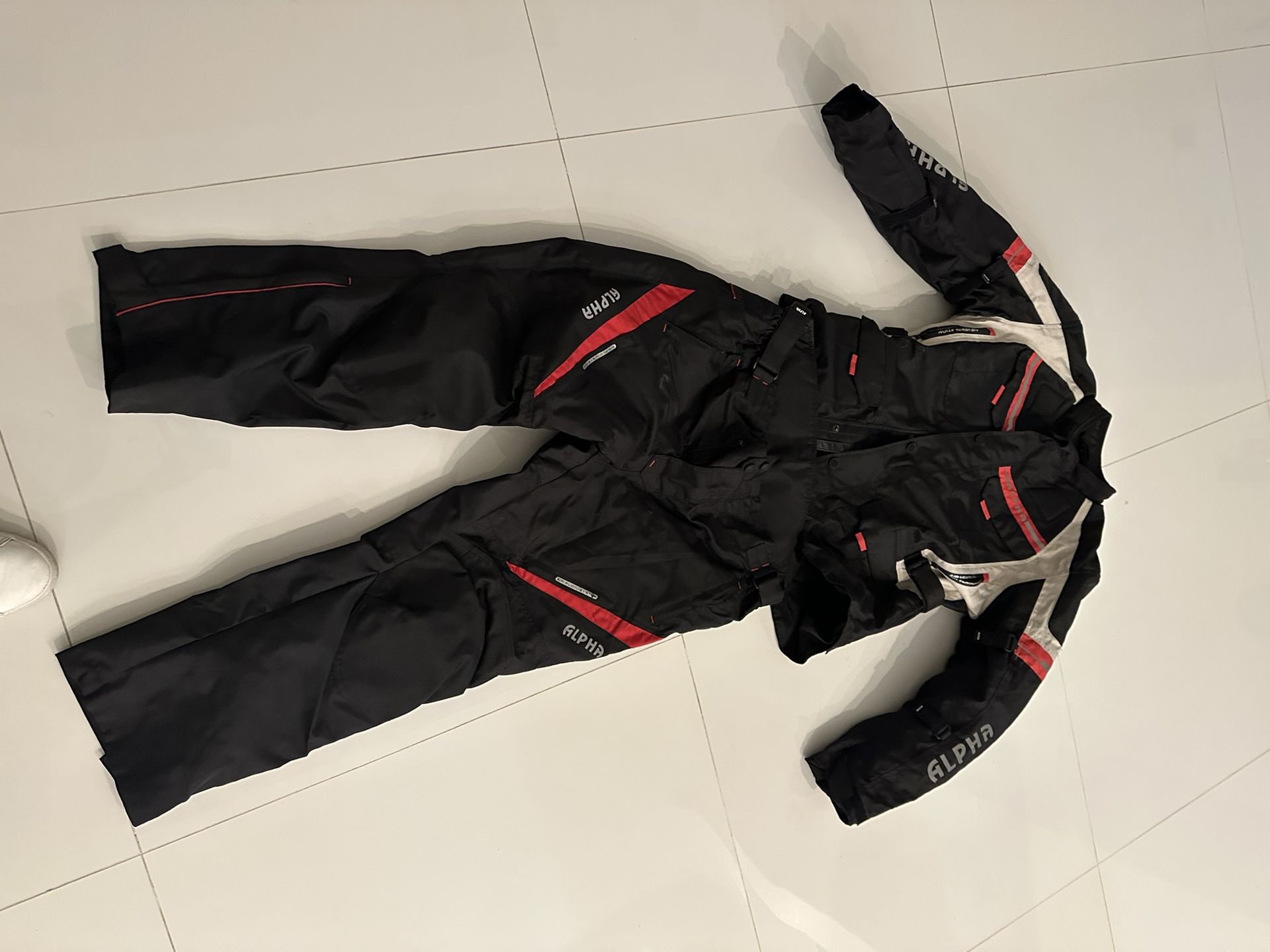 I have a bmw adventure. I don’t use this suit any more. Used it a few times only. Jacket and pants guards and breathing zippers everywhere. Zipper in back to secure with pants. Basically in new conditions. Jacket XL Pants size 40.