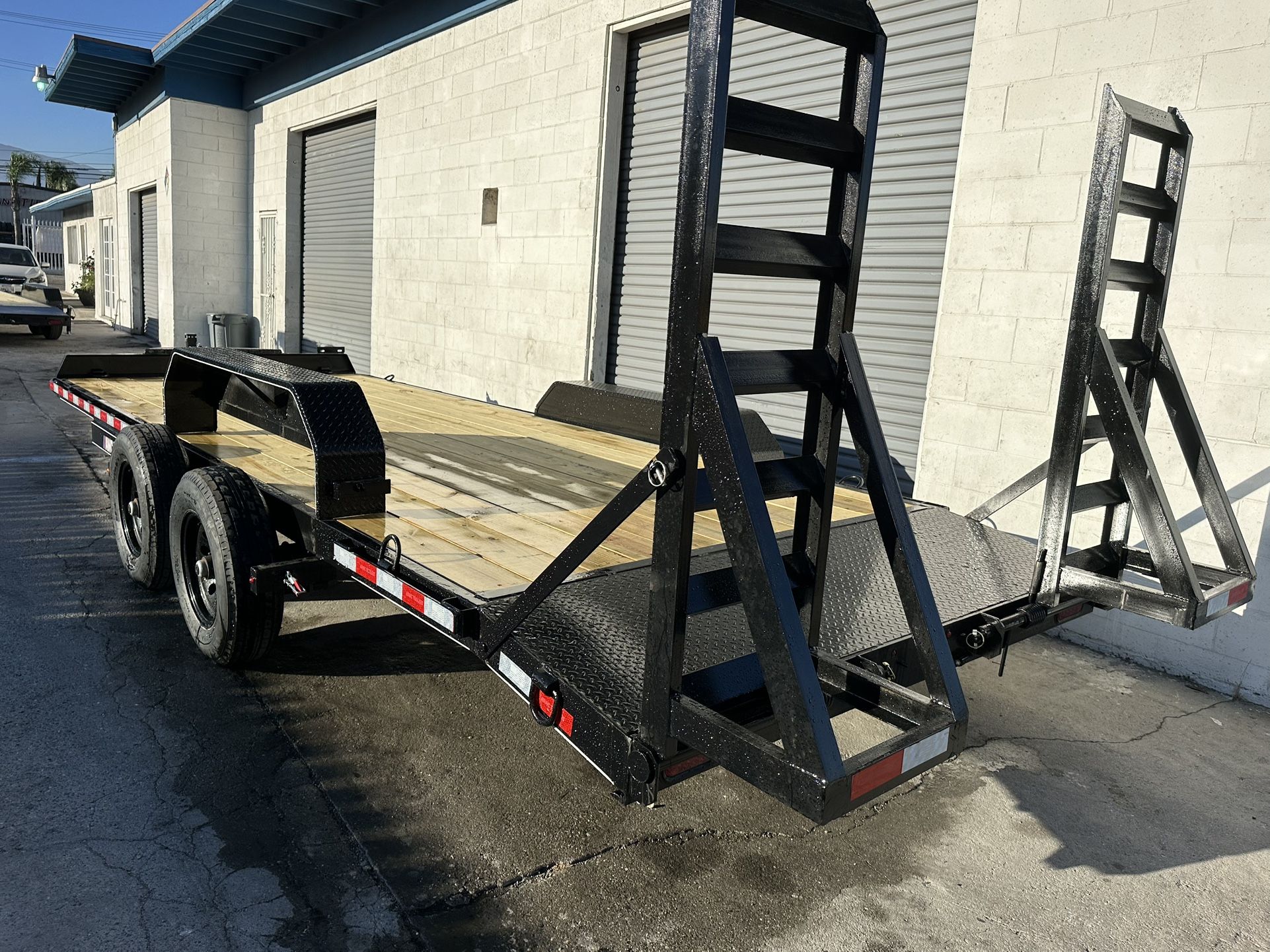 20x7 mid duty car /buggy hauler 6 lug 10k gvwr 6,000 lb axels 2’ dovetail Rub rail both sides 5’ ramps Adjustable coupler 2 5/16 ball hitch connector Tool box with built in winch receiver 4 welded d rings Electric brakes both axels Spare tire mount 7k jack Removable driver fender Heavy duty boxed ramps