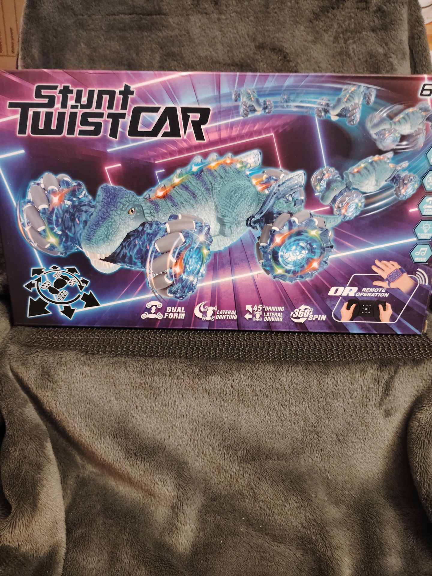 This item is a , Stunt Twist Car a dinosaur-shaped remote-controlled stunt toy designed for children. Features: Performs 360-degree spins, lateral drifting, and 45-degree driving. Operation: Can be controlled via a traditional remote or a wearable gesture-sensing watch. Design: Features LED lights and music effects, with a body design that allows it to twist and overcome obstacles. Performance: Offers off-road capabilities and long-range control for dynamic play.