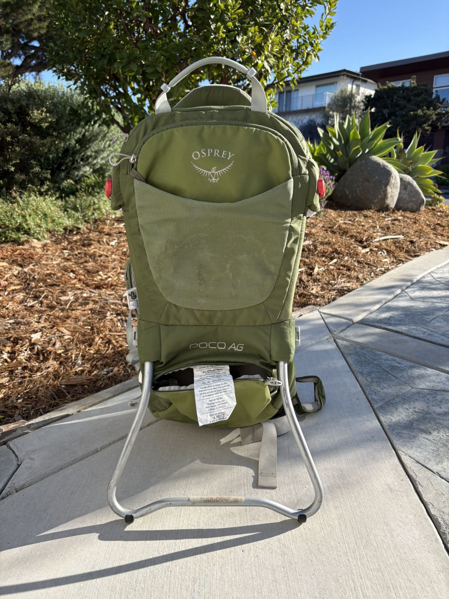 Osprey baby carrier backpack. Very secure and stable pack for hiking with little ones.