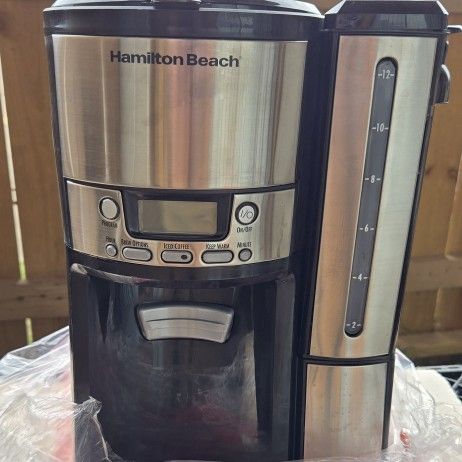 Coffee Maker Features and Details - • Hamilton Beach 12-Cup Coffee Maker – Carafe-Free Convenience • Brand-new coffee maker with no carafe—no spills, no breaks, and no burnt coffee. Brewing and Warming Features • Internal warming heater keeps coffee hot and fresh for up to 4 hours. • On-Demand Brewing: • Dispenses coffee directly into a cup or 7” travel mug at the press of a button. Capacity and Cleaning • Large 12-Cup Capacity: Removable water reservoir for easy filling and cleaning. Maintenance Reminders • Cleaning Reminder: Digital display alerts when it’s time to clean. Shipping, Returns, and Offers - Free Shipping: Within the 48 U.S. states *Note: This coffee maker is not brand new; however, it has been certified renewed by Amazon. For hygiene purposes, it is essential to clean the coffee maker thoroughly before use. Additionally, coffee filters will be required for the machine. Selling as is. Pickup in 77099 area.