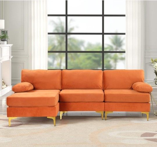 Beautiful modern L-shaped sectional in rich burnt orange velvet with gold legs. Currently stored in two separate rooms for space, but pieces connect easily to form the full sectional (see first photo from original Amazon listing for full setup). ✔ Lightly used (about 6 months) ✔ No pets, no smoking ✔ Clean and well cared for ✔ All connecting hardware included Buyer will need to transport and reassemble (standard sectional setup). Priced to sell – $295 OBO Pickup only.