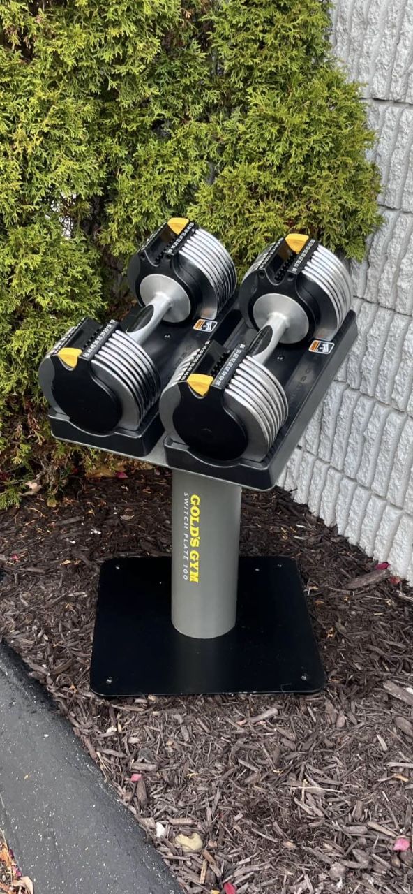 Like new works great 10-50lbs each dumbbell Comes with a nice inverted stand Gold’s Gym, Weider, Weightlifting, Bodybuilding, CrossFit, Zumba, Yoga, Workout, Bench press, dumbbell, Barbell